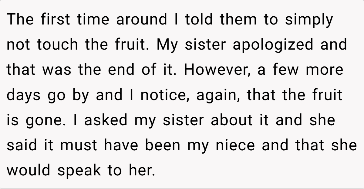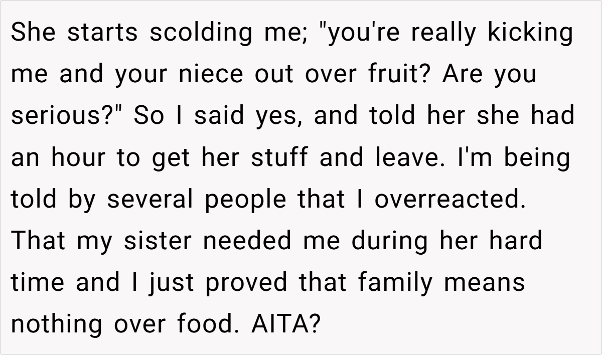 ‘AITA for kicking my sister and niece out after they ate all my wife’s fruit?’