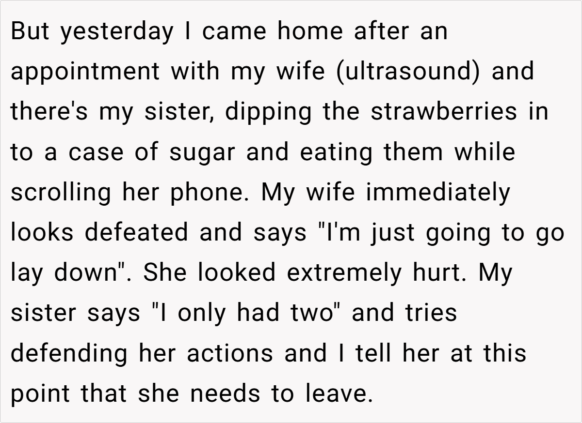 After catching his sister eating the last of the strawberries, he asked her to leave within an hour. Now, family members accuse him of overreacting and claim he prioritized food over supporting his sister in a difficult time. read the original story below…