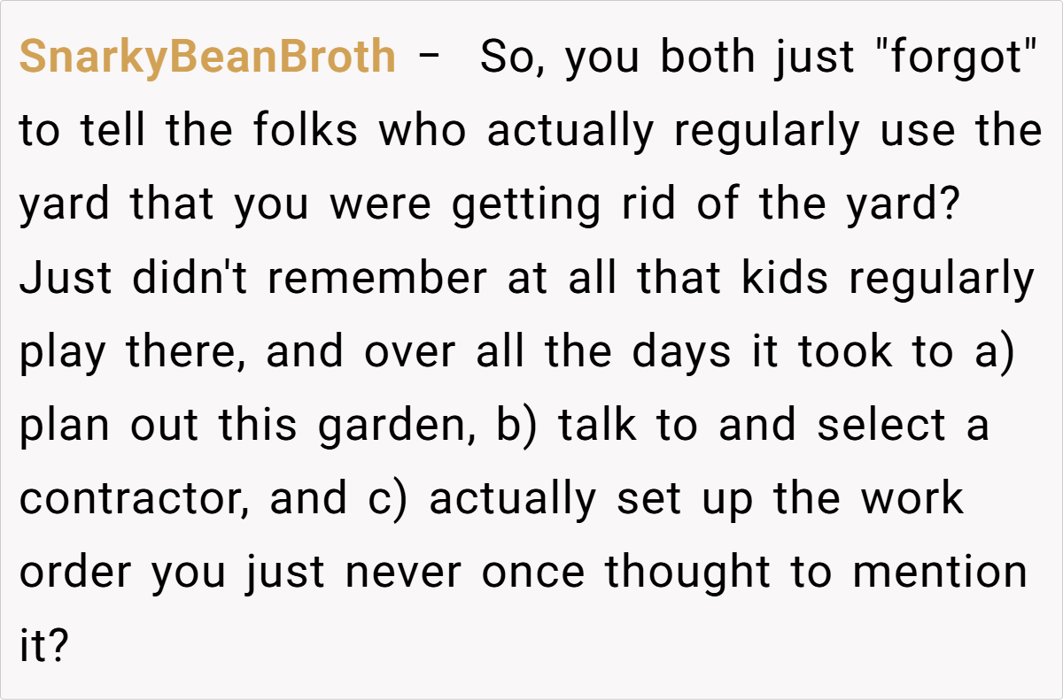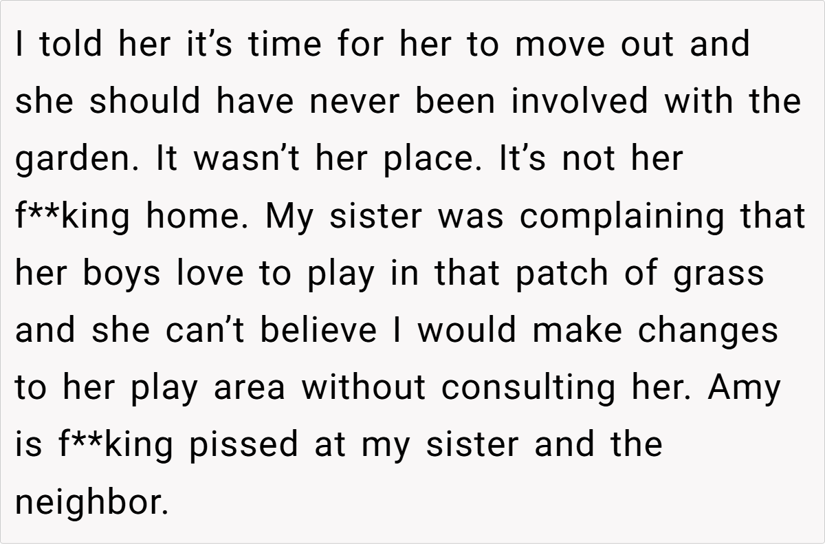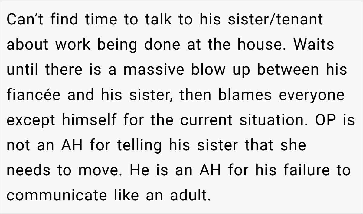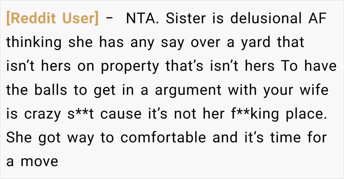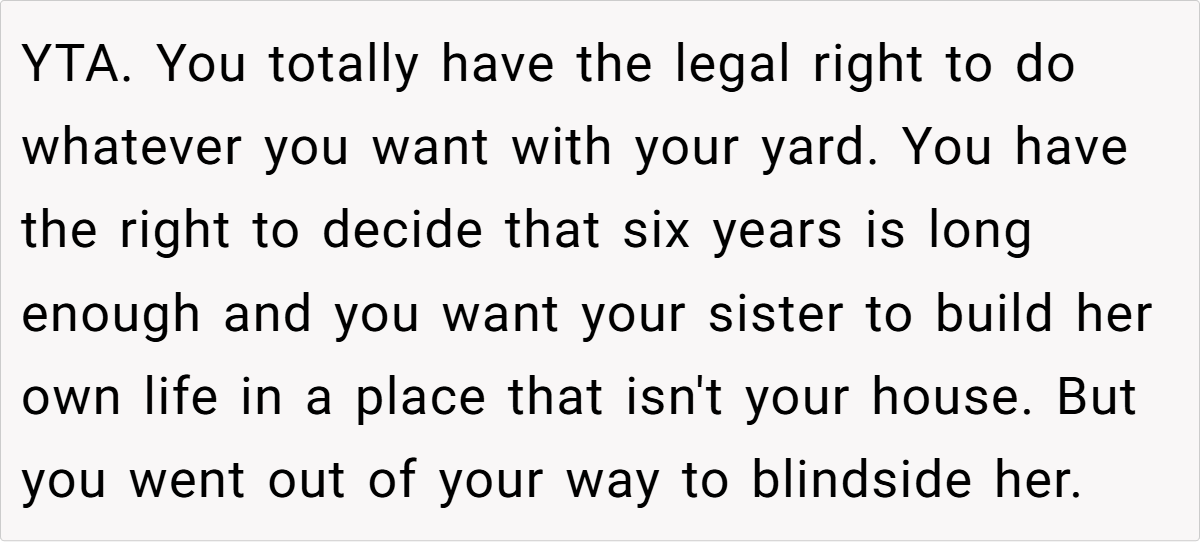 These users argue that the OP and his fiancée were inconsiderate for not communicating the plans to renovate the yard with his sister, who has been living there for six years and whose children regularly play in the area. Some commenters suggest that the fiancée, who is not yet legally married to the OP, has no right to evict the sister. Overall, there is a sentiment that the lack of communication and consideration for the sister’s situation contributed to the escalation of the conflict.