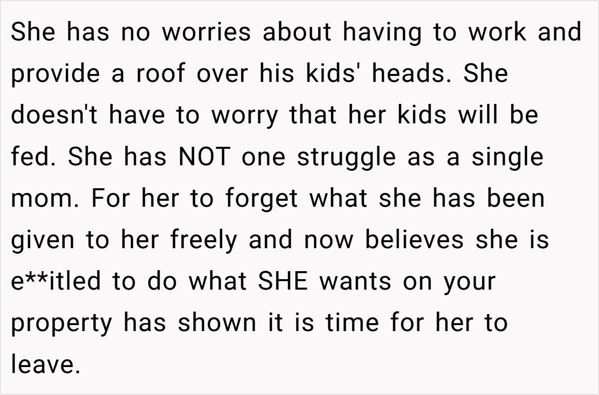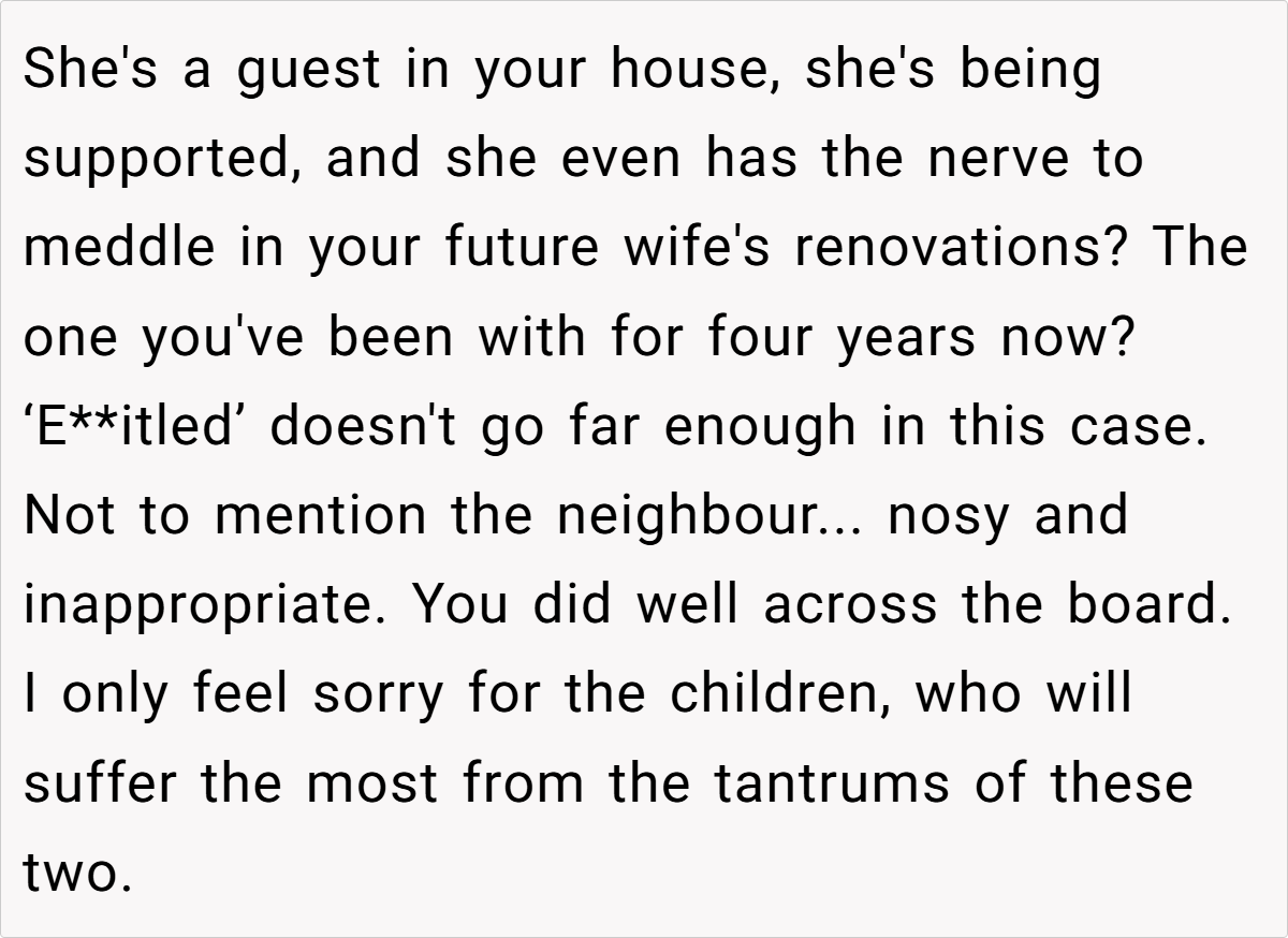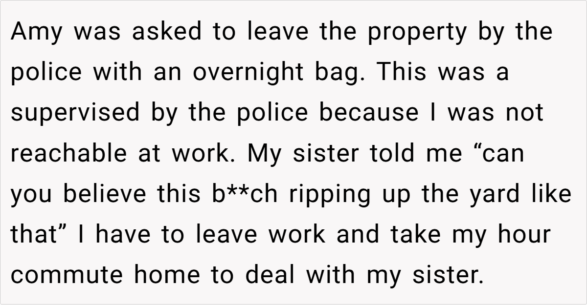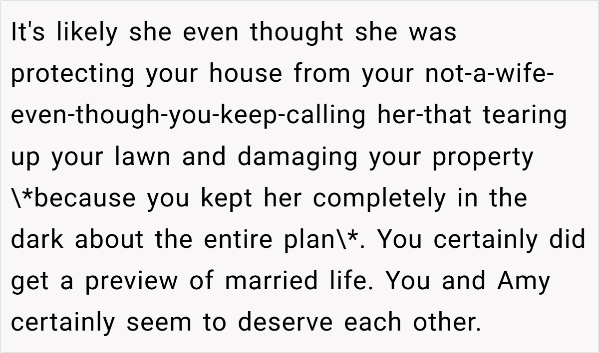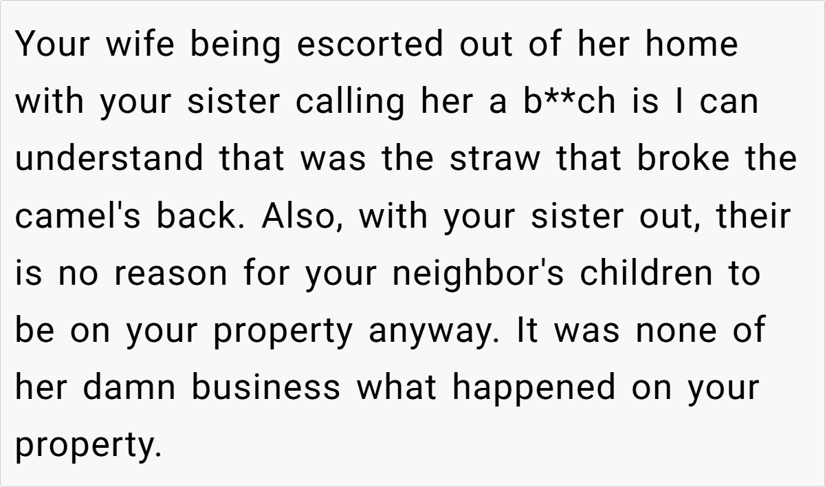 These users argue that the OP and his fiancée were inconsiderate for not communicating the plans to renovate the yard with his sister, who has been living there for six years and whose children regularly play in the area. Some commenters suggest that the fiancée, who is not yet legally married to the OP, has no right to evict the sister. Overall, there is a sentiment that the lack of communication and consideration for the sister’s situation contributed to the escalation of the conflict.