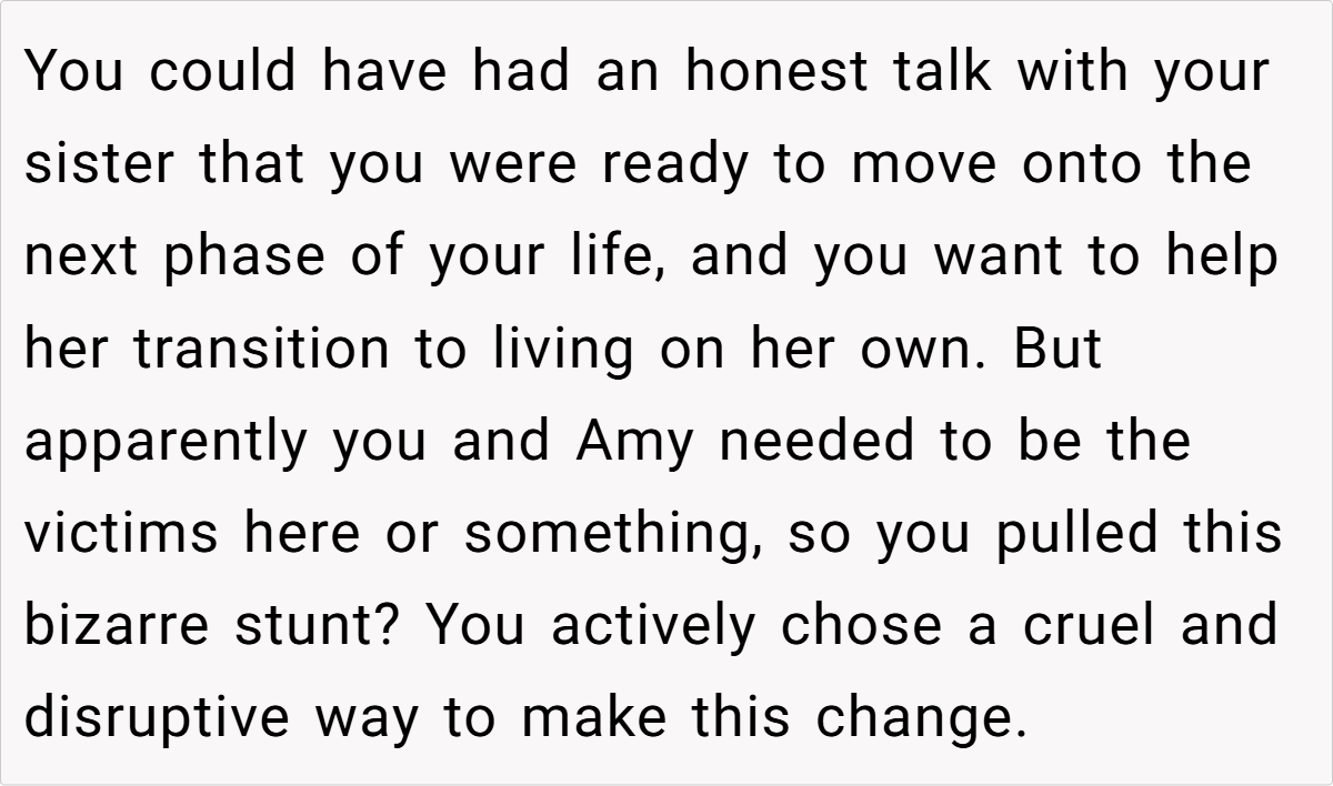 Controversial, but in this isolated situation, YTA. Being there for your sister and supporting her is a wonderful and selfless act, but you can’t suddenly take her security and home away without any warning. Amy should also be considerate of this, as sounds, potentially, like she is quite keen to get rid. Of course you need your own life and future but to tear apart your sister and her children’s home and safety net without warning is totally unacceptable. No way did you not have time to discuss this. Yes, your sister’s reaction was extreme, but also a result of panic, hurt, and fear of having nowhere to go and being alone. Seems like it’s been dealt with badly and quite thoughtlessly. The neighbour, however, is a different issue. They are definitely YTA and made a difficult situation much worse, but this is not the fault of your sister. You have been there for her for so long, but you need to gradually give her the confidence and guidance to be on her own. There are children involved and they will suffer hugely if this situation isn’t managed carefully.