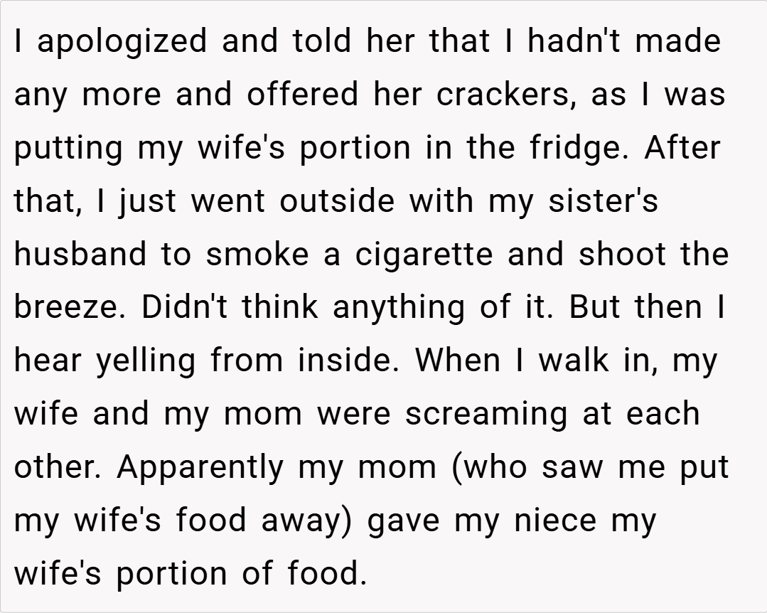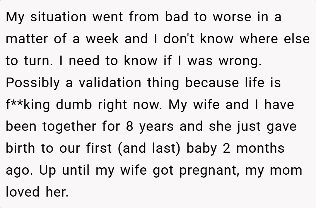 When family conflicts escalate to physical violence, the fallout can be nothing short of devastating. Our OP, a 40‑year‑old man, shares a painful story of how his world turned upside down after a dinner at his family’s house. After his wife—who recently gave birth to their baby two months ago—exchanged harsh words with his mother over a trivial food dispute, things quickly spiraled out of control.