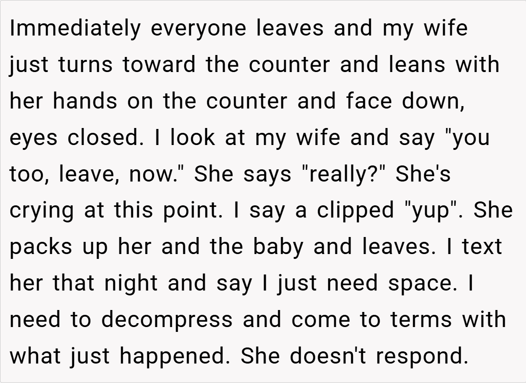 In the wake of such trauma, even the smallest missteps can reopen old wounds. Though his wife later apologized and even attempted to work out a visitation schedule for the baby while she packs, the OP’s pain and inability to forgive remain unresolved.