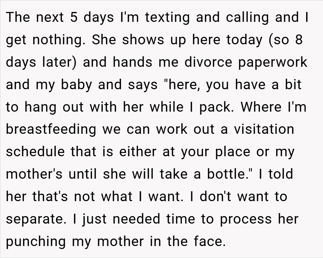 In a moment of shock and desperation, his wife punched his mom in the face, an act that left everyone stunned and shattered the fragile peace that had barely been restored after previous tensions. In response, the OP felt compelled to protect his family’s space and emotional well‑being by immediately ordering his wife to leave. Now, with divorce papers in hand and the house feeling empty, he’s left wondering if his drastic reaction makes him the asshole.