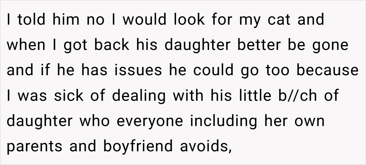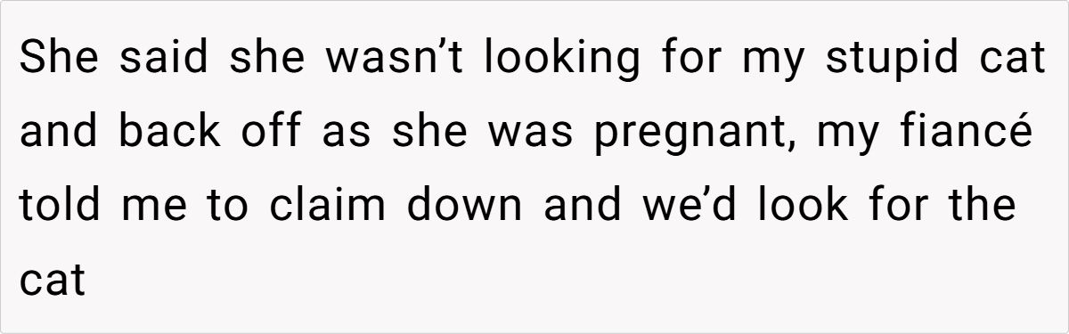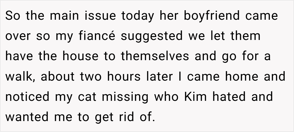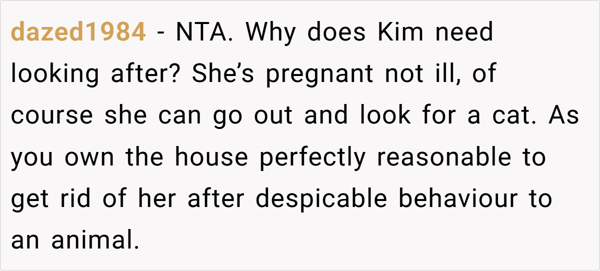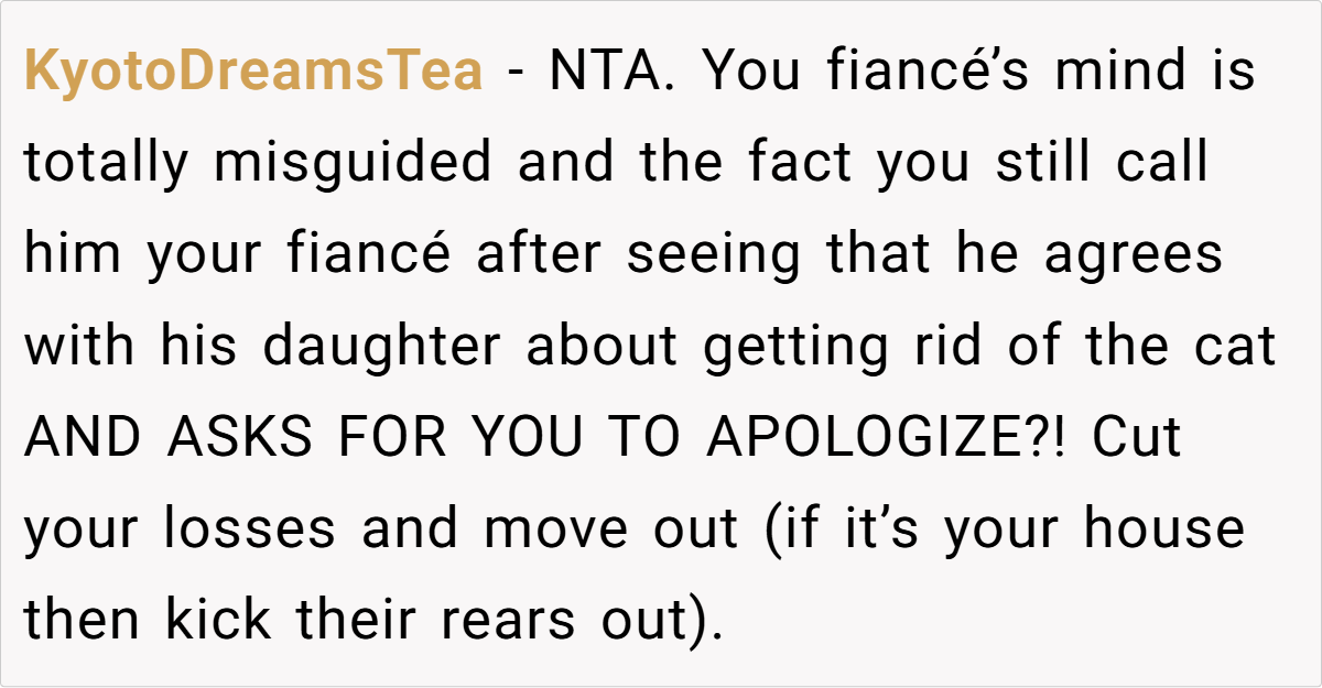 Kim threw OP’s beloved pet outside and lied about it. OP’s fiancé? Instead of holding his daughter accountable, he made excuses—blaming pregnancy hormones and even suggesting they were already planning to get rid of the cat for the sake of the baby. But when OP demanded Kim leave, the fiancé had the audacity to ask for an apology.