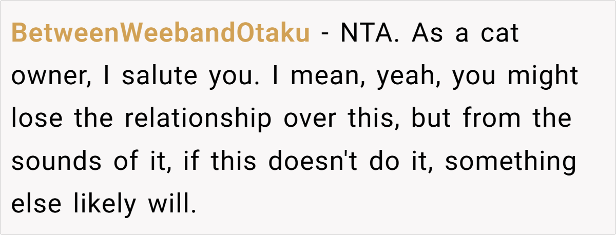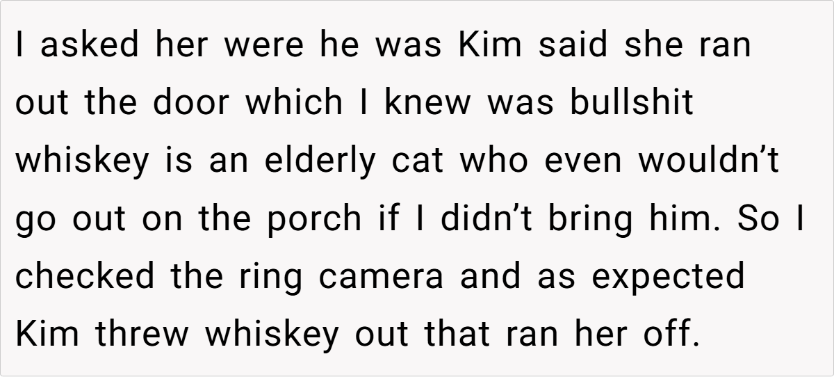 - Ensure Whiskey’s safety – Kim may still hold a grudge, and OP needs to be extra cautious about her cat’s well-being moving forward.