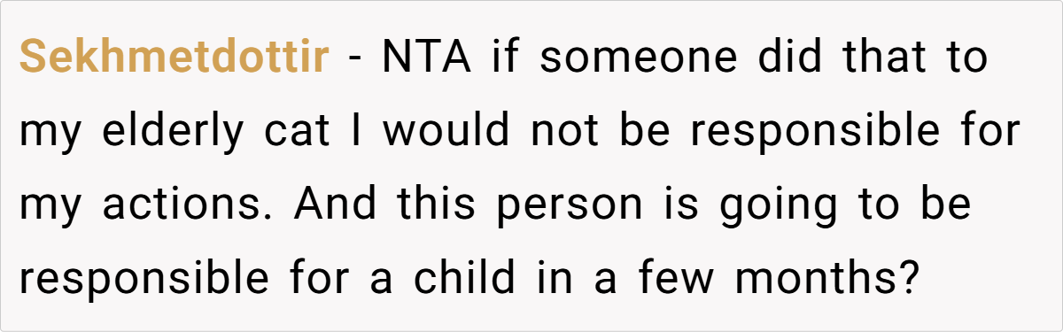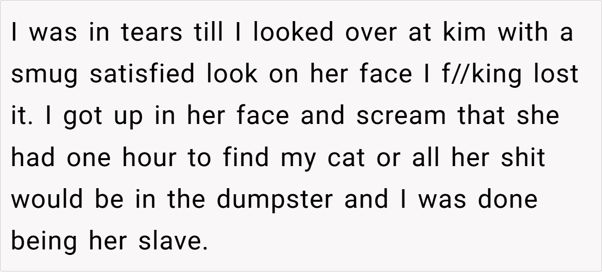 Kim knew OP loved her cat. She knew the cat was old and vulnerable. And she knew OP would be devastated. This wasn’t pregnancy hormones—this was malice.