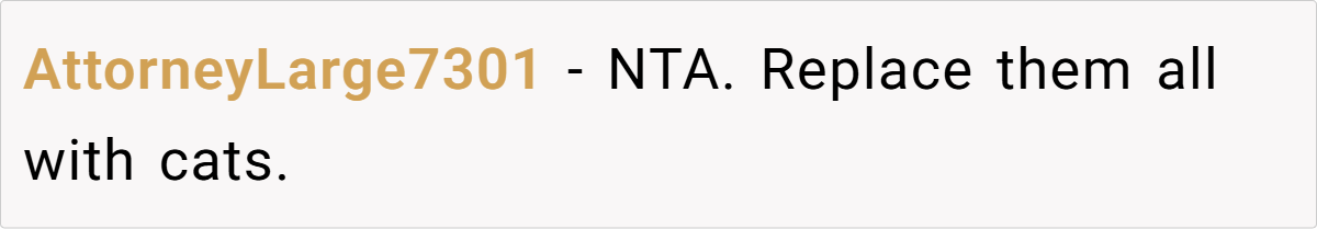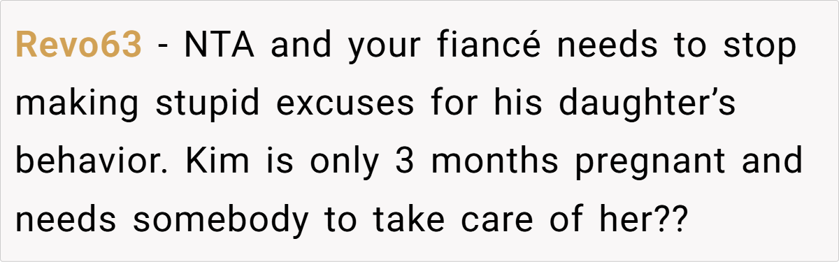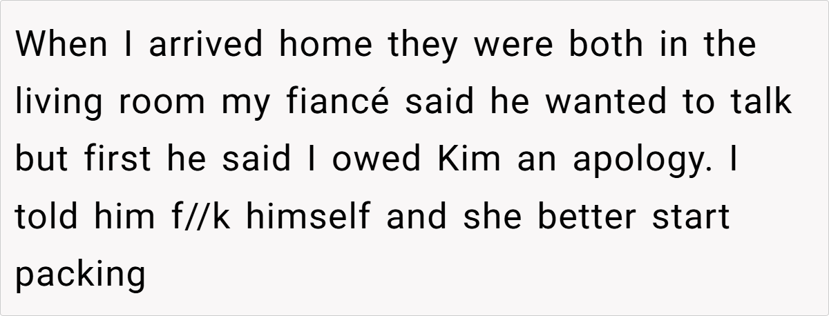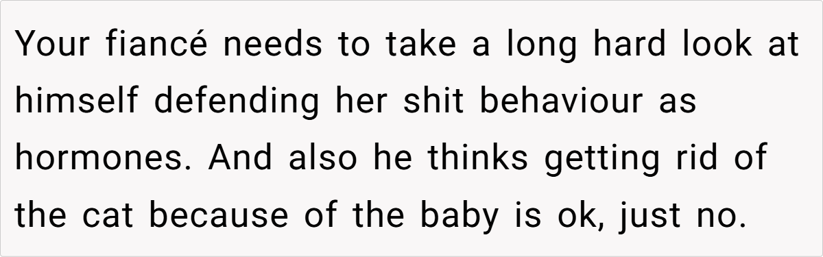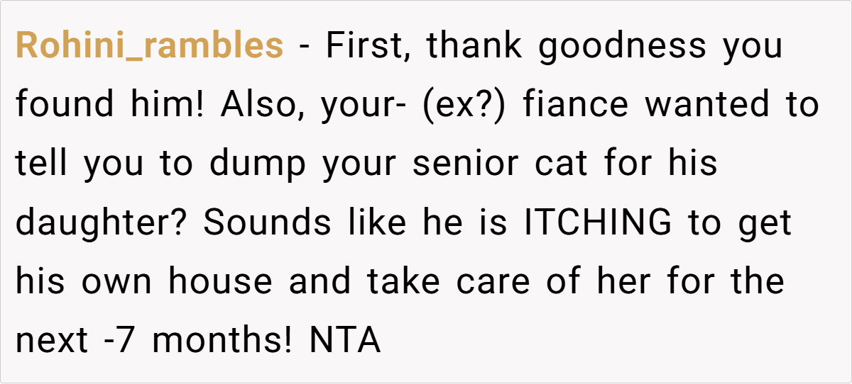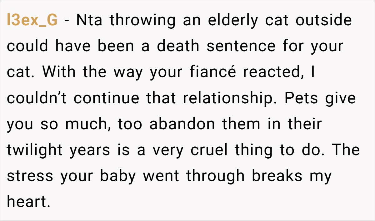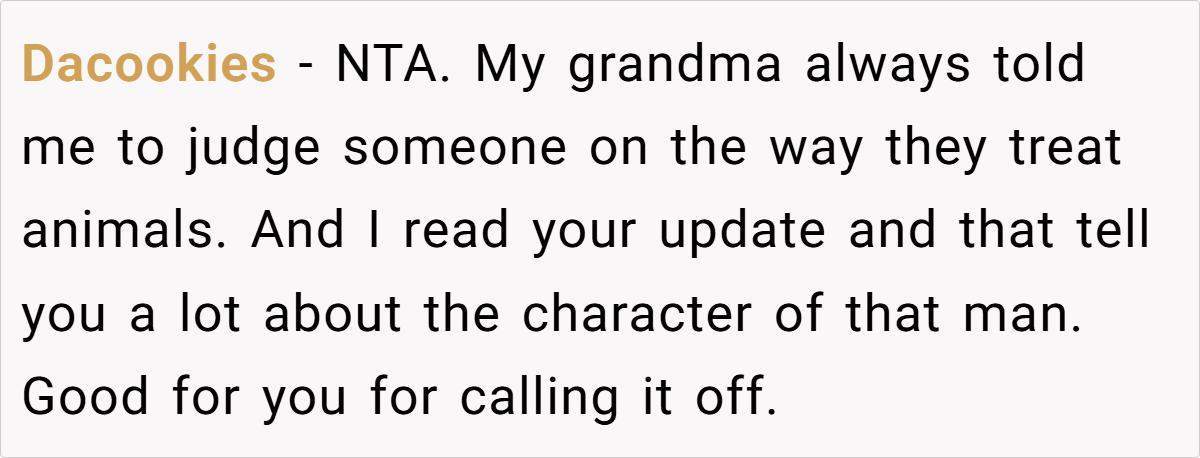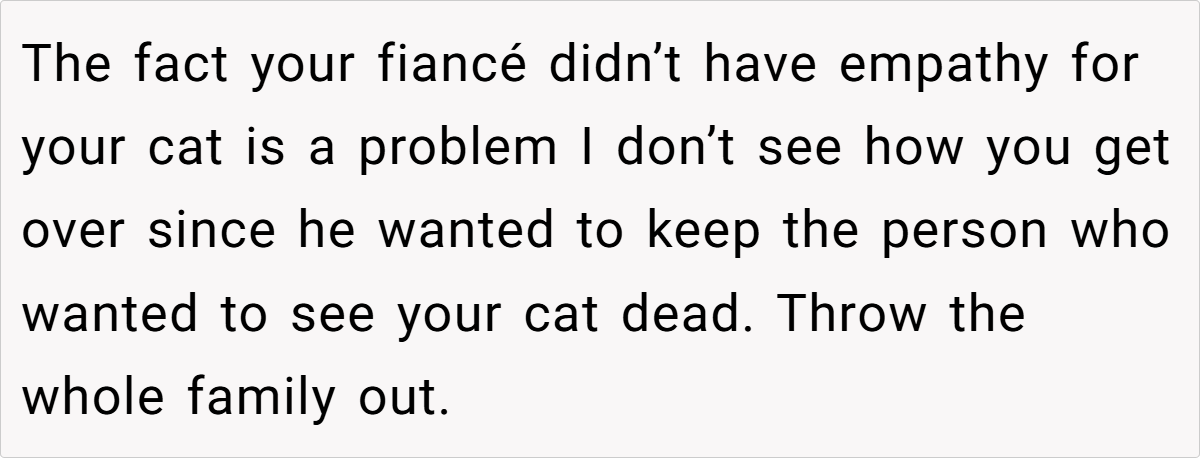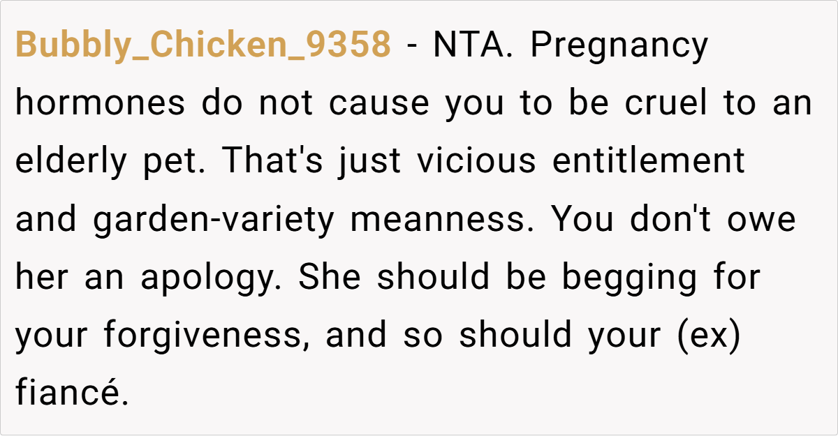 Instead of acknowledging how deeply unacceptable Kim’s actions were, OP’s fiancé immediately made excuses. Worse, he revealed that he had already been considering forcing OP to get rid of her pet. That level of dismissiveness toward a beloved family member is a massive red flag.