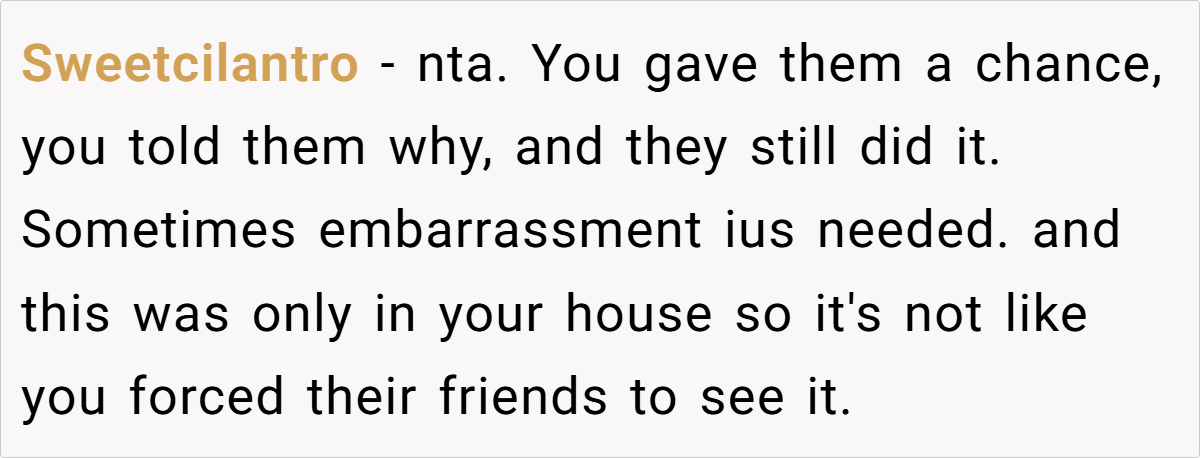 In this case, OP’s kids may not have intentionally been malicious, but their repeated disregard for a simple request suggests they didn’t truly respect the consequences of their actions—until those actions had social repercussions.