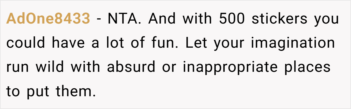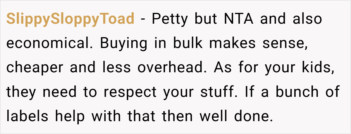 Many users praised OP’s commitment to pettiness, with some suggesting even more extreme labeling tactics. Others pointed out that embarrassment was a justifiable consequence for adult children who failed to respect boundaries.