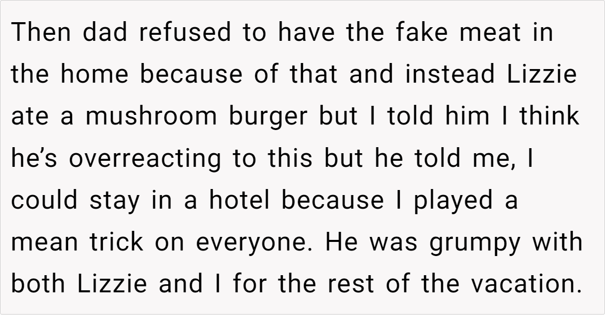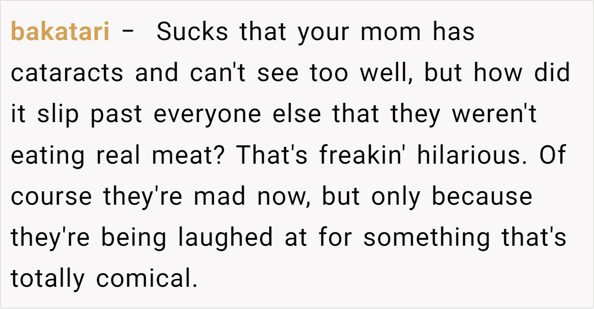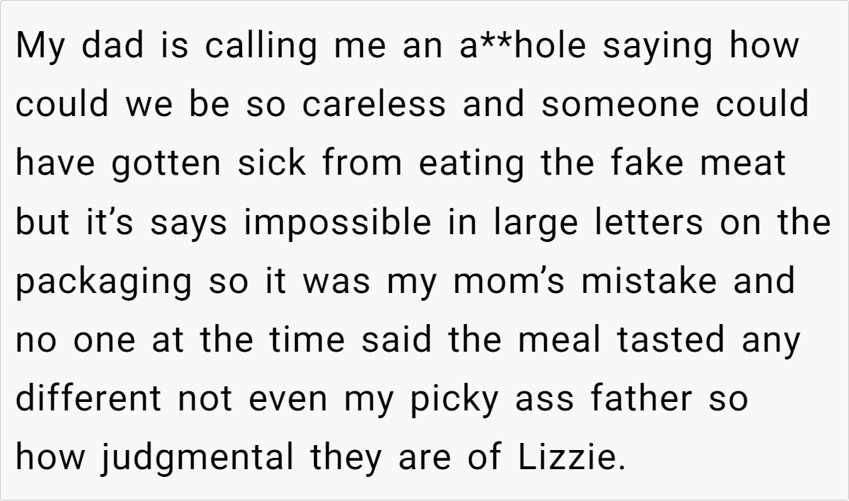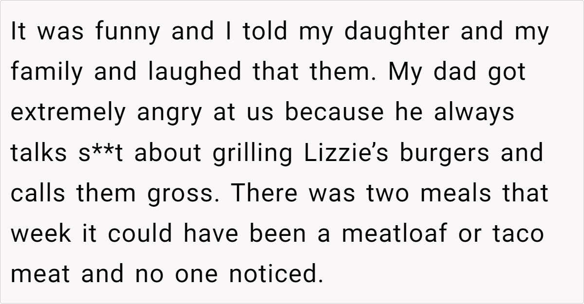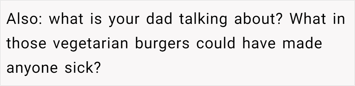 Despite the family’s usual teasing about her dietary choices, no one seemed to notice when real meat was accidentally swapped for the plant-based version. Instead, the situation escalated into a hilarious moment that even had the daughter laughing along, while one very grumpy dad took the mix-up as a personal affront.