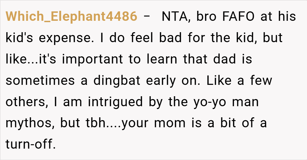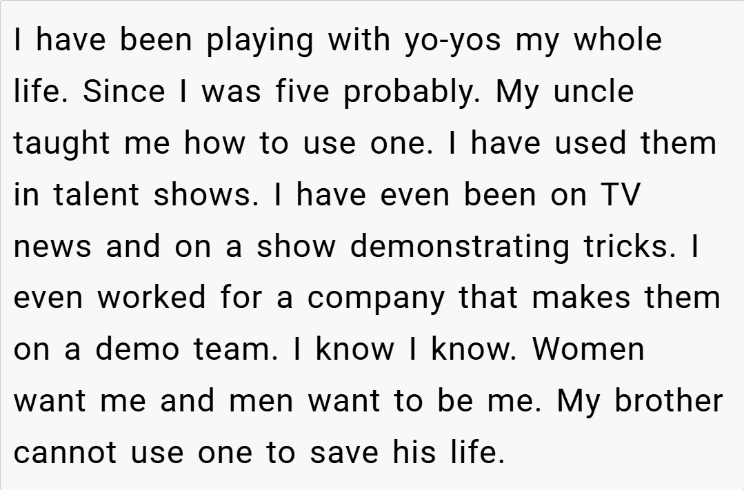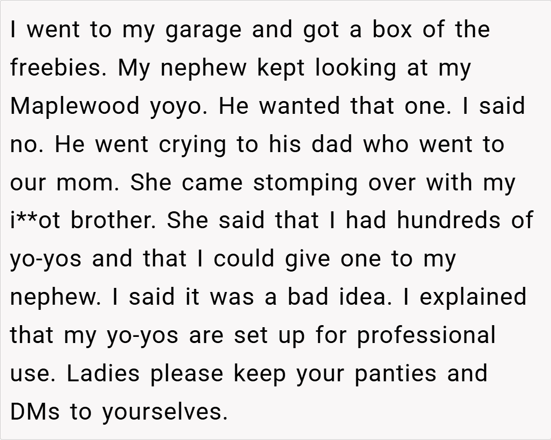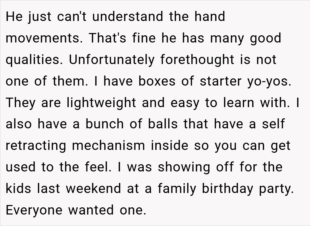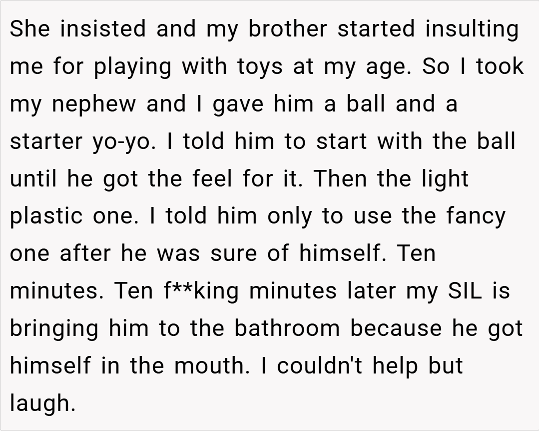 Many redditors sympathize with the storyteller, noting that his background as a yo-yo expert and his careful selection of age-appropriate toys show that he wasn’t negligent, and his laughter was a spontaneous, if unfortunate, reaction to an unexpected mishap.
