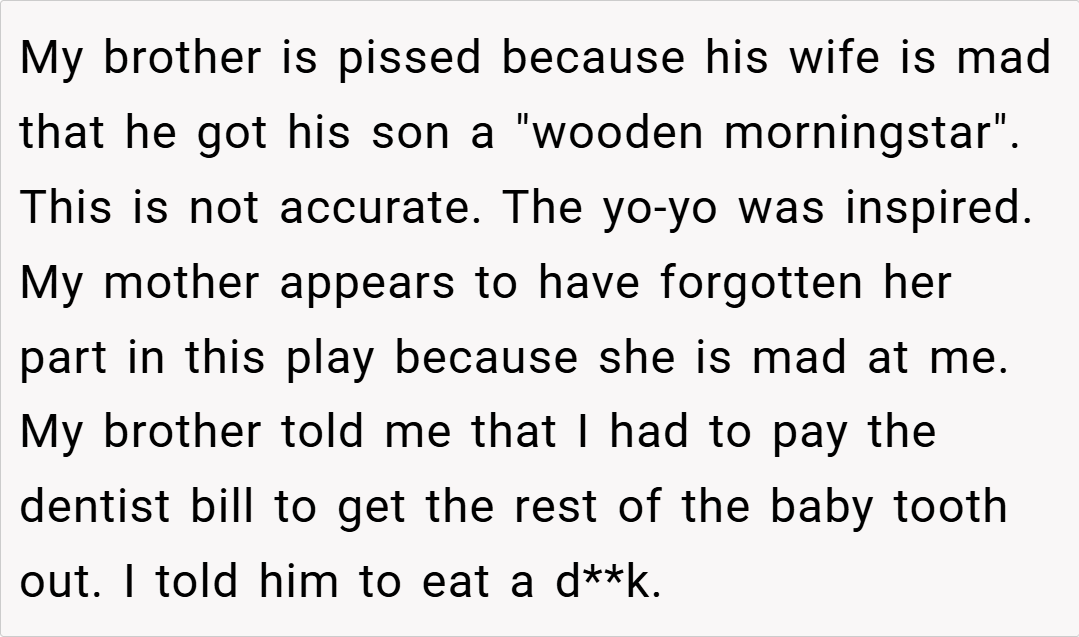 ‘AITA for laughing when my nephew got hurt and knocked out a tooth with a toy my brother insisted I give him?’