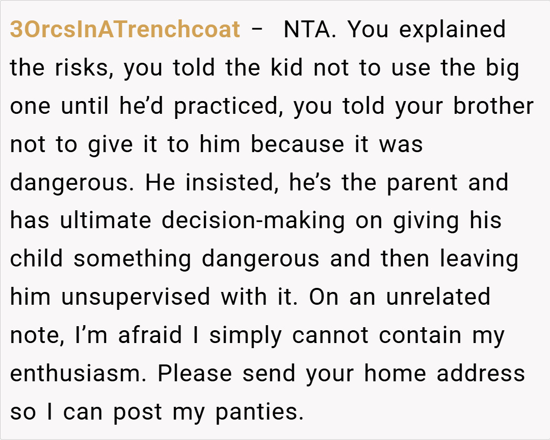 The challenge here lies in navigating between humor and responsibility. While our storyteller’s technical advice was sound, his reaction, amplified by family tension and past resentments, has left many questioning whether he fully considered the emotional aftermath for his nephew and the parents involved.