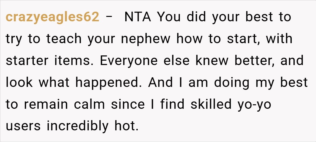 In conclusion, this story underscores the delicate balance between humor and responsibility in family settings. While our storyteller clearly intended to share his expertise and guide his nephew safely through learning a new skill, the accident—and his subsequent reaction—sparked a cascade of hurt feelings and family discord.