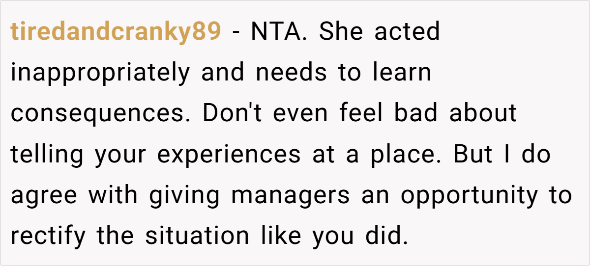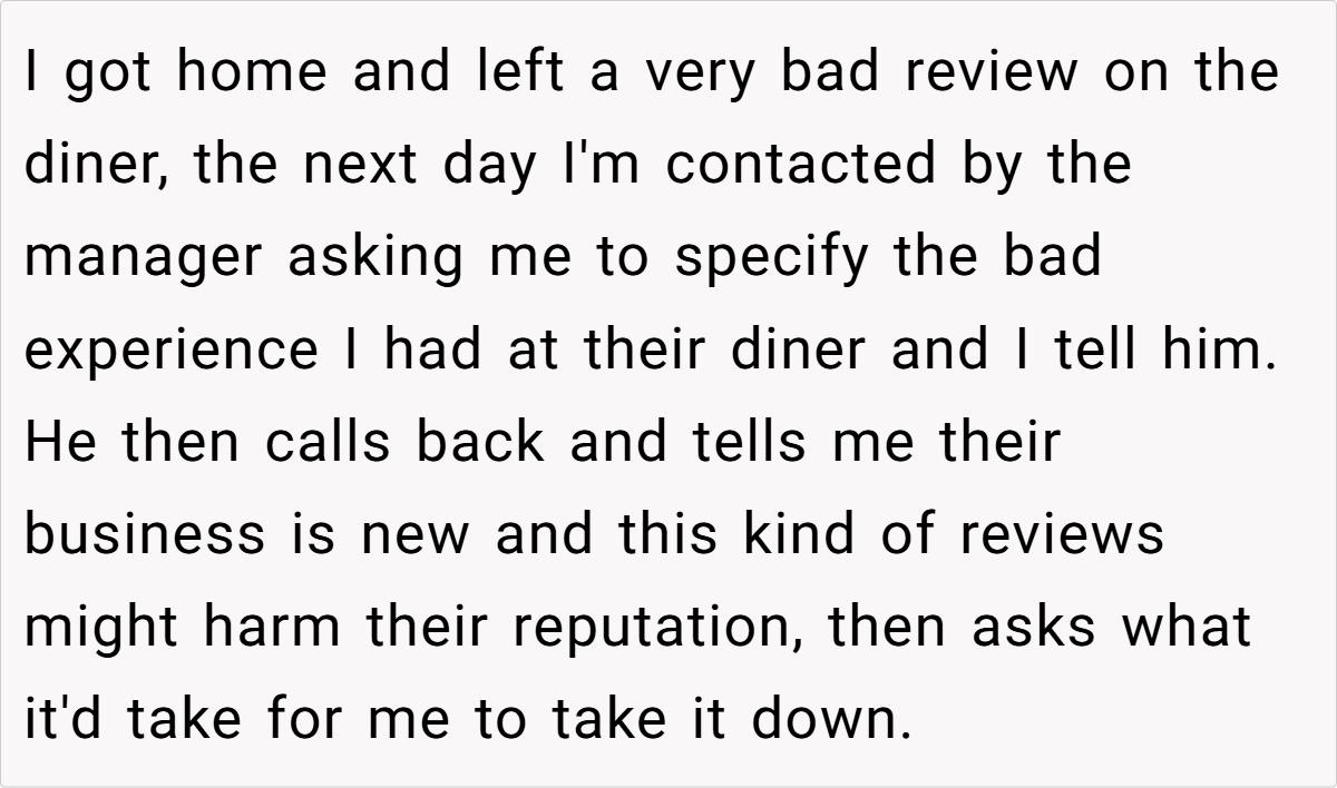 1. Speaking directly to the manager in private – Instead of leaving a harsh review, OP could have addressed the issue discreetly and let management decide on an appropriate response.