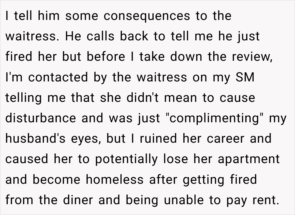 AITA for leaving a bad review on a diner and ruining the waitress’ life just because she was “complementing” my husband’s eyes?