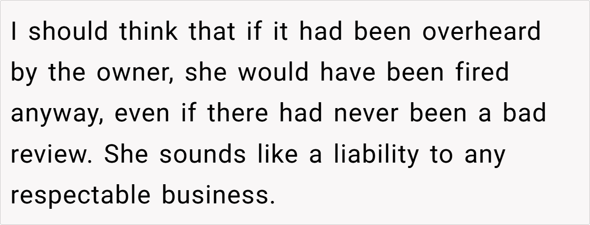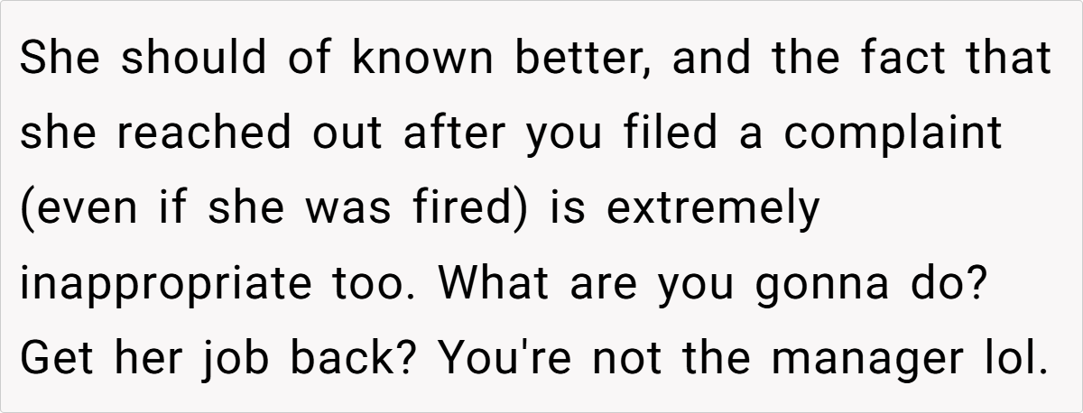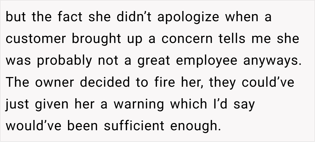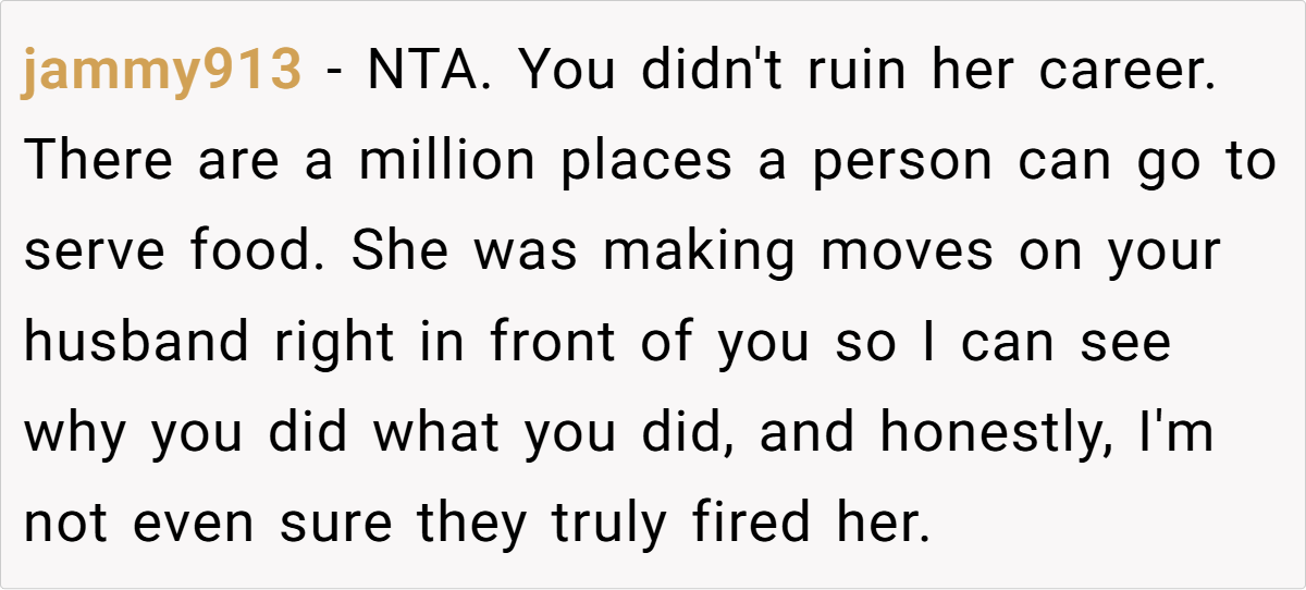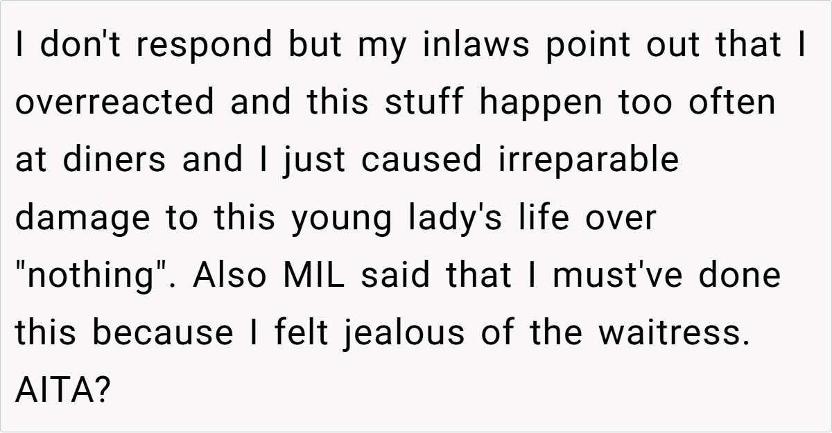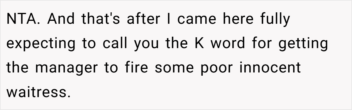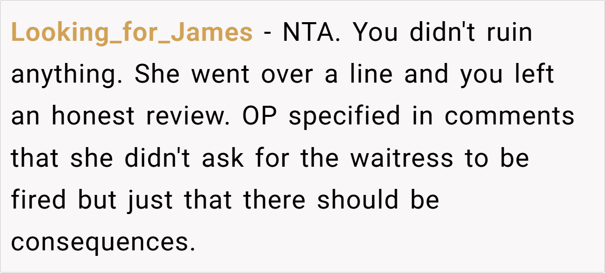 OP’s decision to call out the waitress might have been emotionally charged, but was it entirely unjustified? Probably not. However, where she may have crossed the line was escalating the issue to the point where the waitress lost her job. A formal complaint to the manager could have sufficed without pushing for termination.