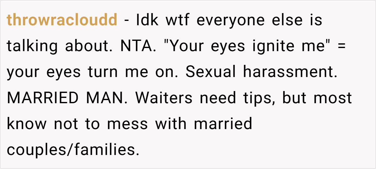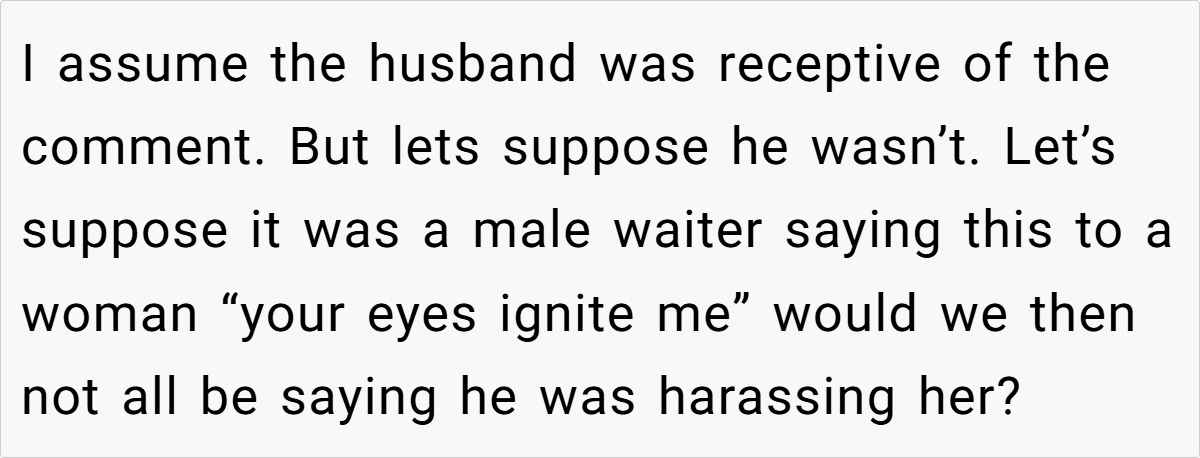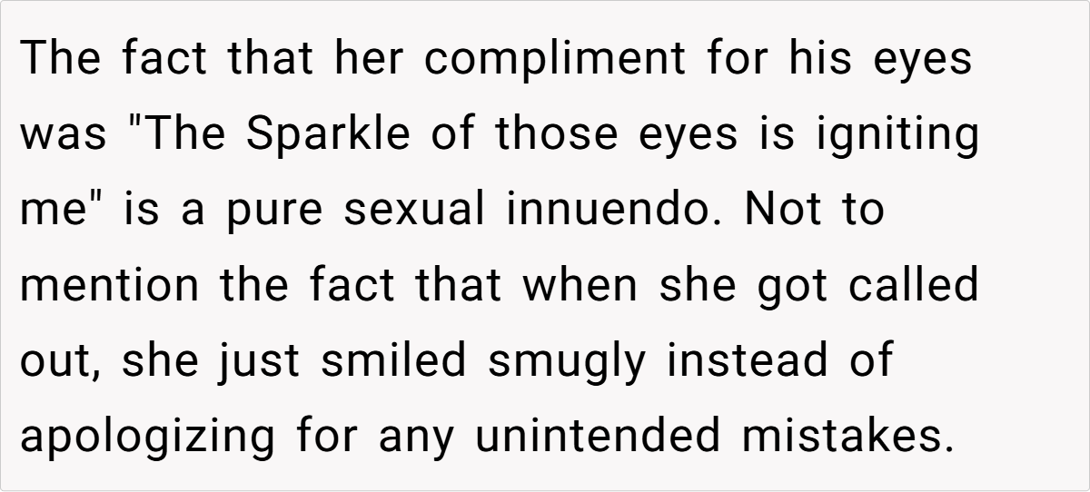 In OP’s case, the comment “the sparkle of those eyes is igniting me!” wasn’t just friendly—it carried strong suggestive undertones, especially given that the recipient was celebrating his birthday with his wife and in-laws. While some might brush this off as casual banter, the intent behind words can vary, and perception matters.