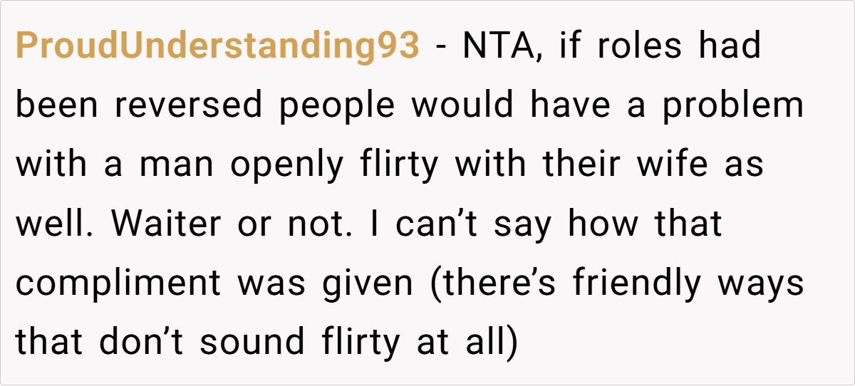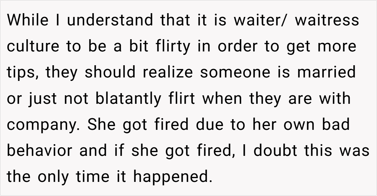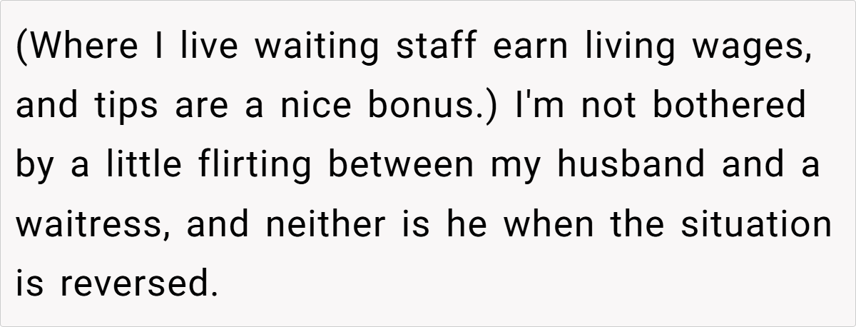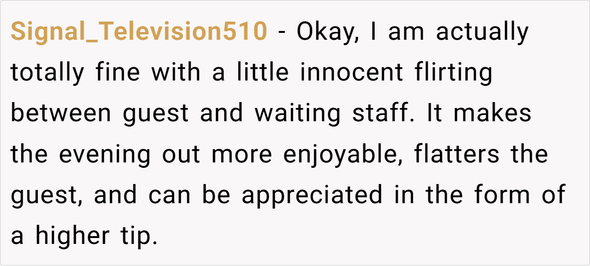 Some might argue that OP let jealousy cloud her judgment. However, research suggests that excessive flirting in service settings can create discomfort, particularly in romantic relationships. A study by Dr. Lisa Mainiero, professor of management at Fairfield University, found that when employees blur the line between friendly and suggestive behavior, it often leads to conflict, especially in settings where one party feels disrespected.