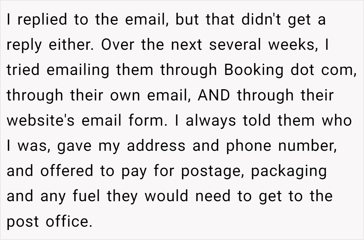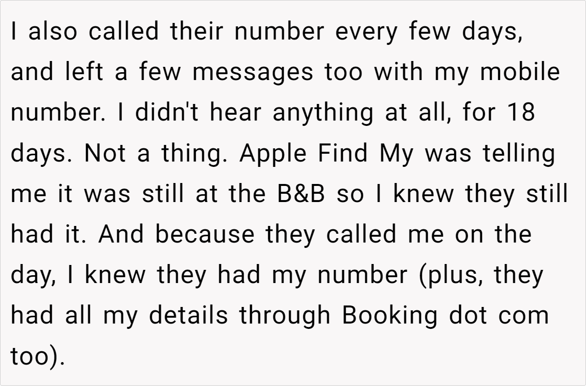 As CNET explains, “Documenting every attempt to contact and recover lost property can significantly expedite the resolution process, ensuring that your case is taken seriously by all parties involved.” This expert insight resonates here, where our storyteller’s methodical record-keeping ultimately pressured the B&B owner into action. The process illustrates that, while patience is a virtue, persistence combined with proper documentation is key when dealing with unresponsive service providers.