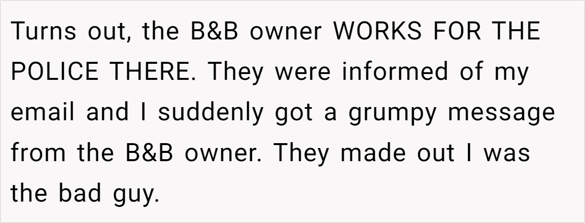 The conflict reached a boiling point when, after nearly three weeks of no response, the traveler turned to local law enforcement for assistance. This decision was not taken lightly, as it was meant to be a last resort to resolve a misunderstanding rather than a hostile act. The fact that the B&B owner works for the local police only added a layer of irony to the unfolding drama. It underscores how personal accountability and professional roles can sometimes clash in unexpected ways.