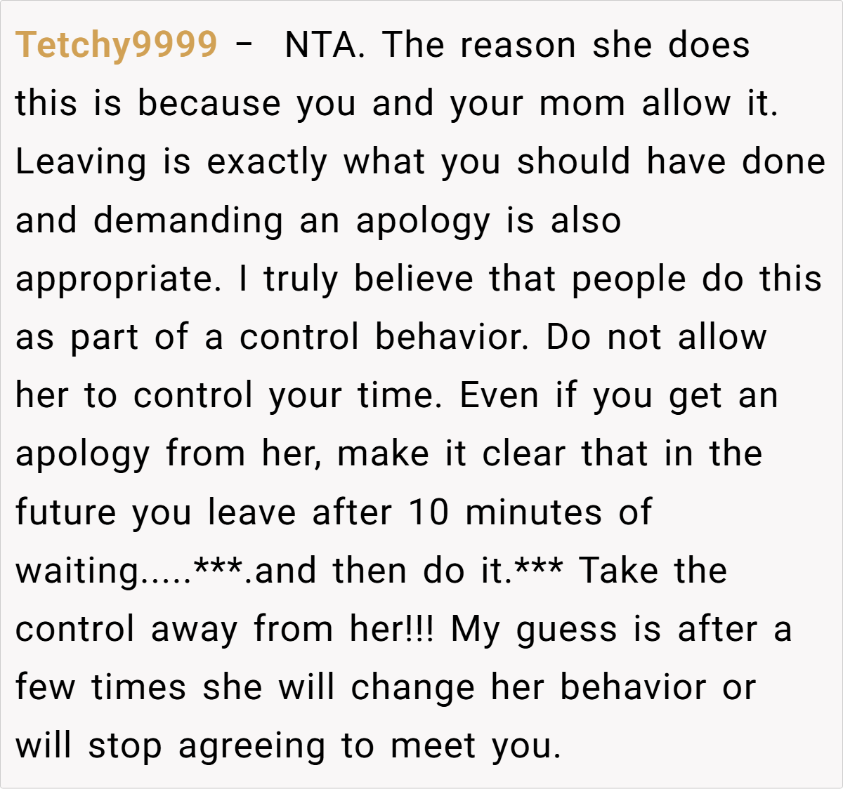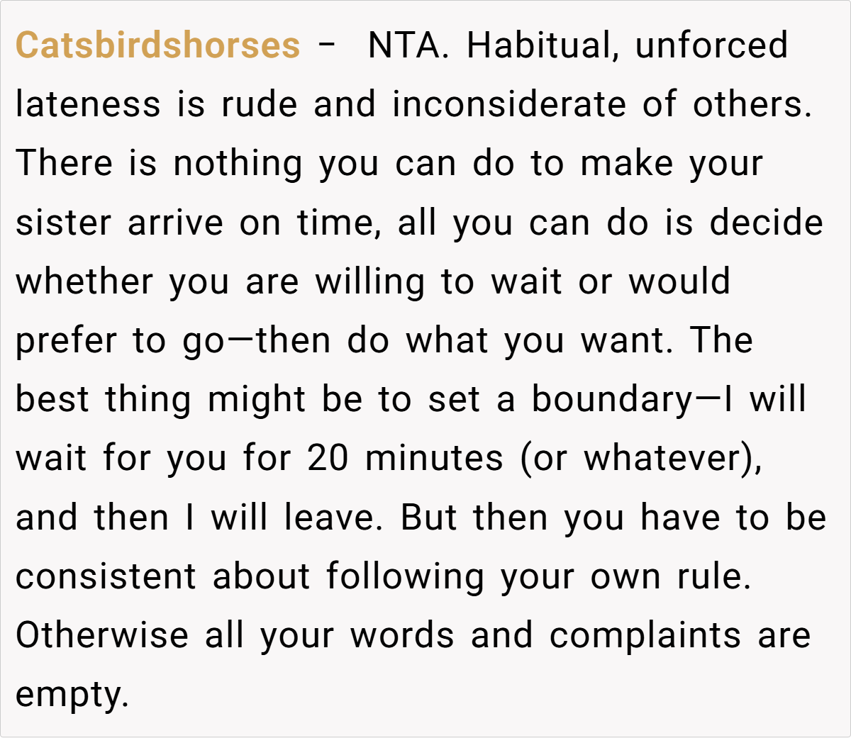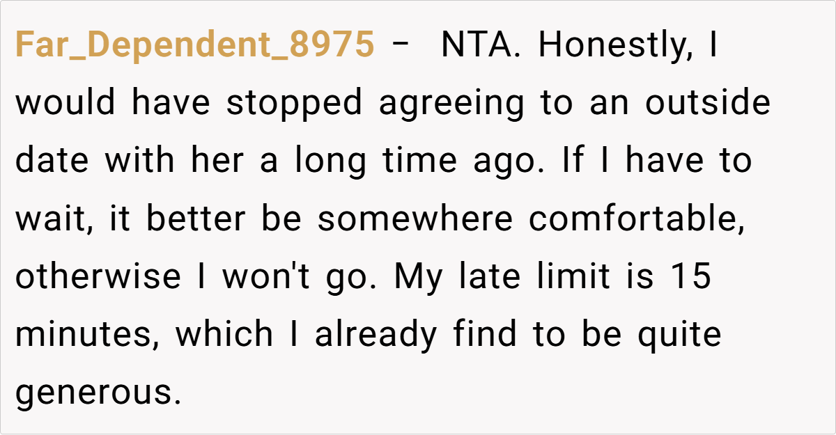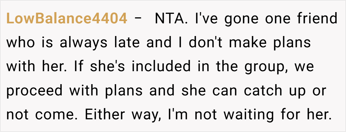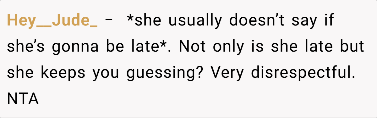 The prevailing sentiment among commenters is clear: the host is NTA. Many agree that if someone habitually disrespects your time—especially when it’s family—setting boundaries is not only fair but necessary. Commenters have suggested enforcing a strict waiting limit, such as 10–15 minutes, and have urged others to stop making plans with someone who fails to value punctuality. The consensus emphasizes that the host’s actions are a healthy assertion of her own time and worth, and that expecting an apology is entirely reasonable.
