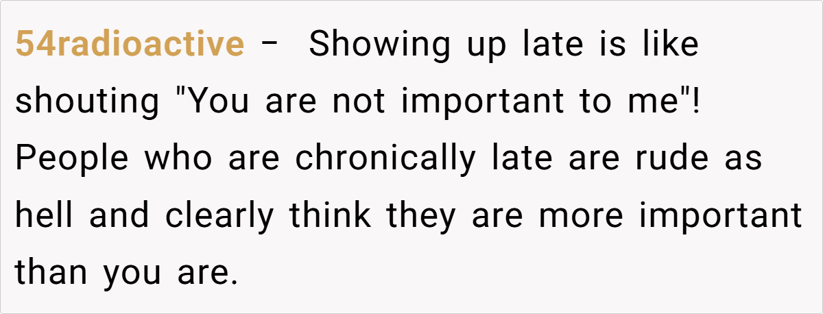 Interpersonal relationship experts often emphasize the importance of respecting others’ time as a fundamental aspect of healthy communication. Dr. Elaine Martin, a relationship counselor, notes, “Consistently arriving late can signal a lack of consideration and respect. In social and family settings, punctuality is not just about the clock—it’s about valuing each other’s time and effort.” The host’s frustration is rooted in the repeated disregard for an agreed-upon schedule, which, over time, has built up into a significant breach of trust and respect.