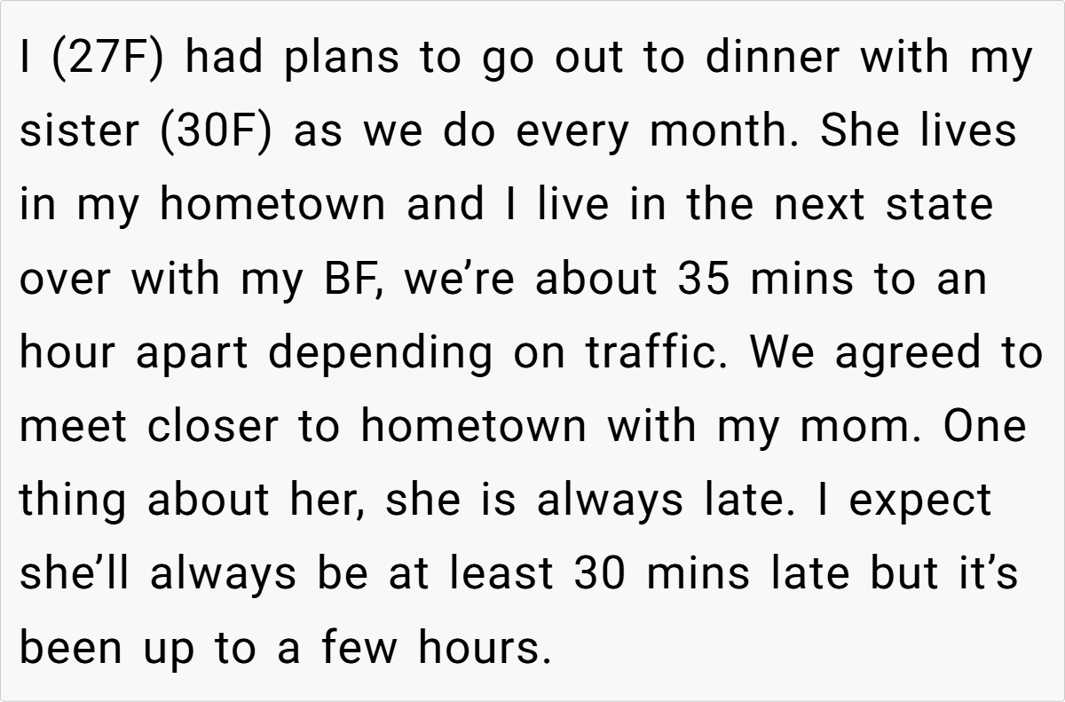 Family outings are meant to be a time of connection and enjoyment, yet punctuality is a key ingredient that, when missing, can sour even the most cherished traditions. In this story, a 27-year-old woman recounts a dinner that ended in frustration due to her 30-year-old sister’s habitual tardiness—a pattern that has long disrupted their monthly meetups. Despite repeated discussions with both her sister and their mom about the importance of being on time, the sister’s consistent lateness has grown from a minor annoyance into a significant breach of respect.