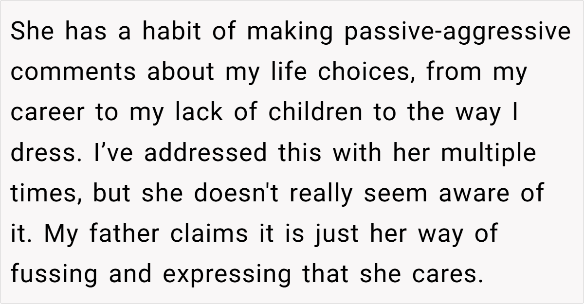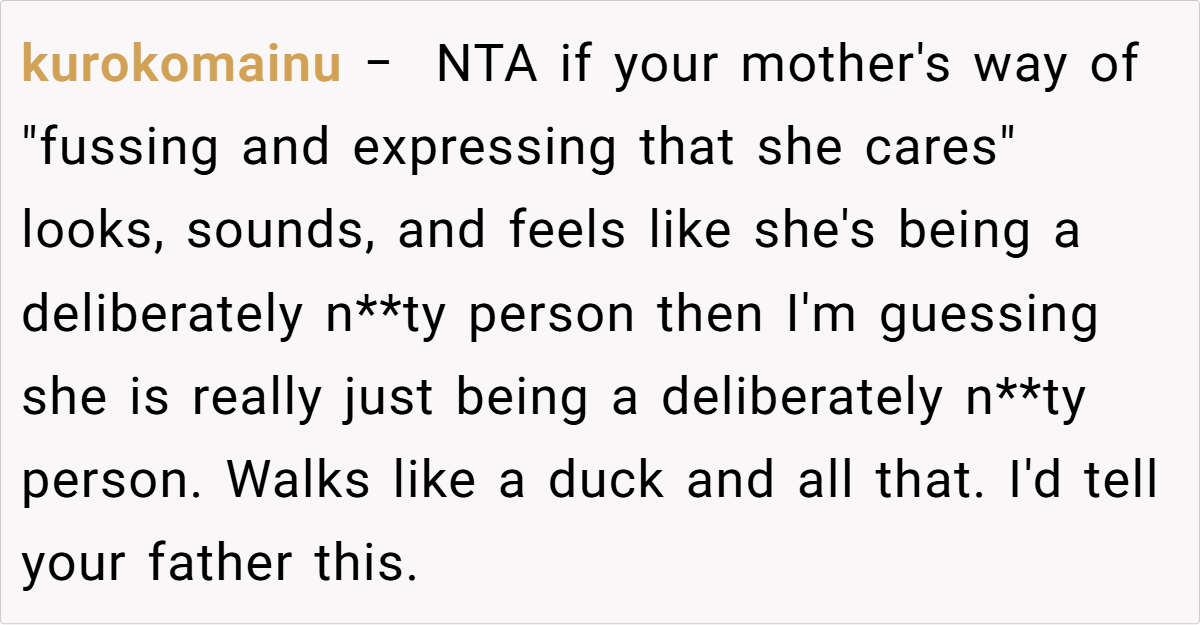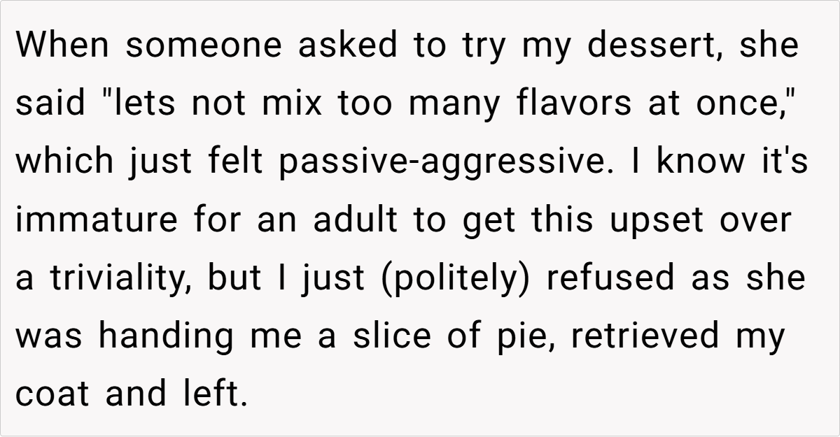 In our narrator’s case, her decision to leave was less about the pie itself and more about refusing to accept yet another instance of being undermined by a parent whose well-meaning “fuss” has, over time, evolved into an emotionally charged pattern of behavior.