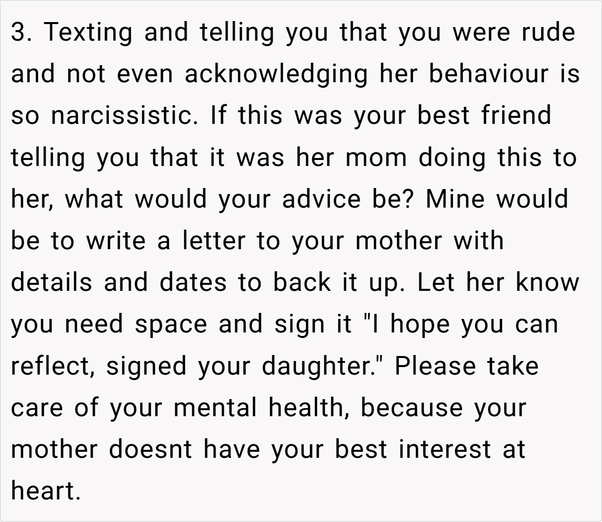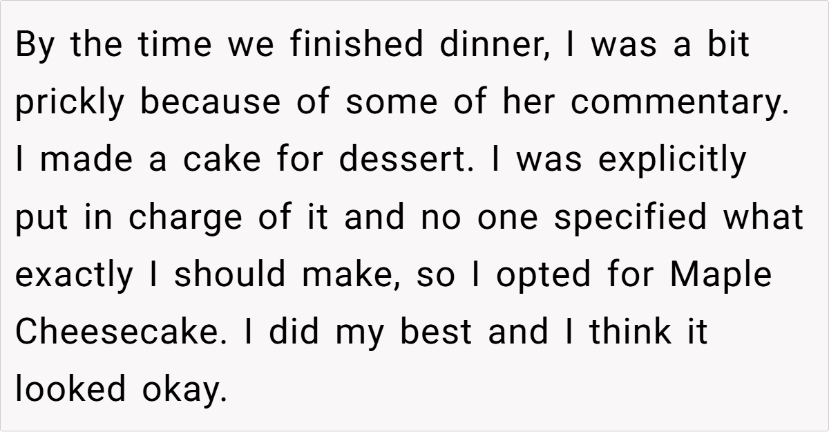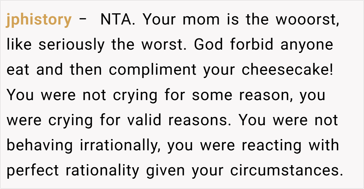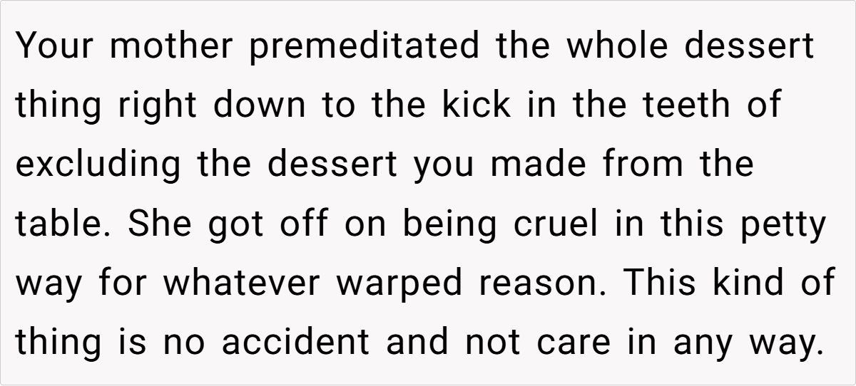Furthermore, her reaction highlights the complex interplay between self-respect and familial expectations. When family members repeatedly impose their views—often under the guise of care—the resulting tension can lead to disproportionate emotional responses. Instead of simply critiquing a dessert choice, her mother’s actions tapped into a long history of perceived favoritism and neglect.