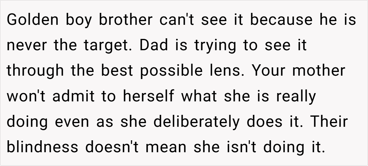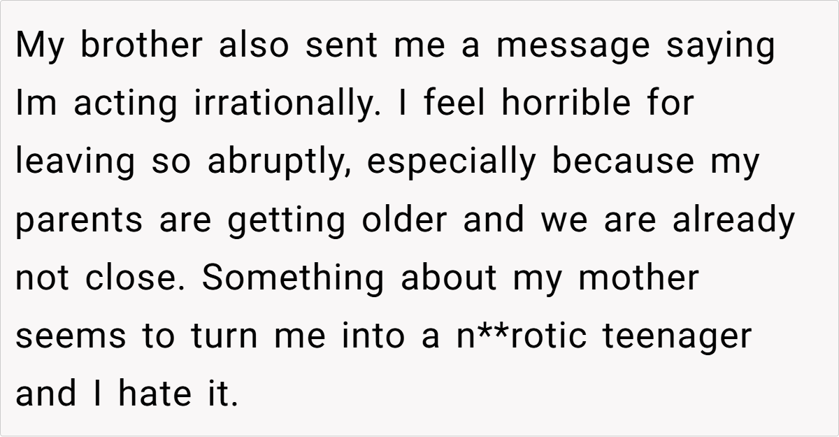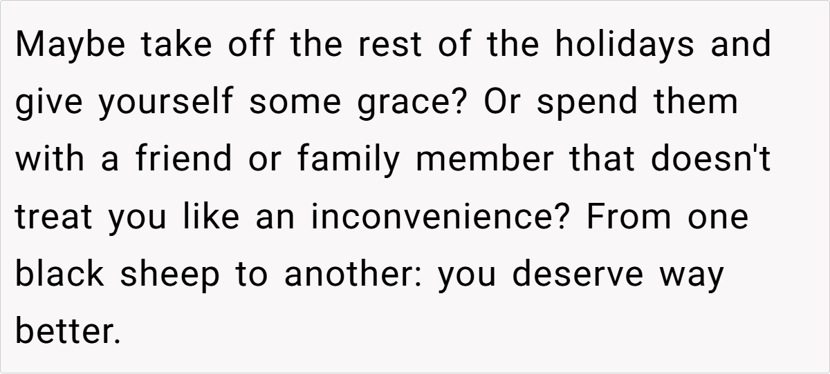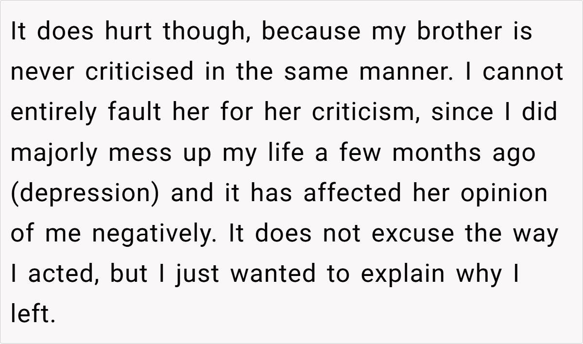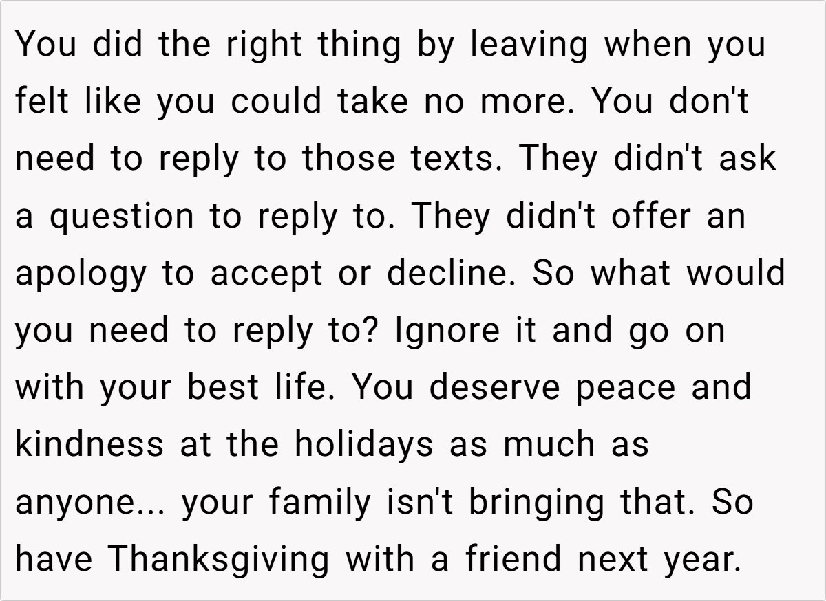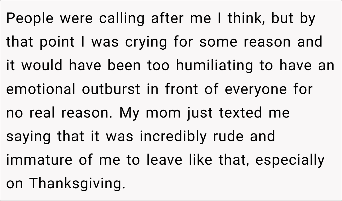 In that moment, the familiar pattern of passive-aggressive critiques and subtle comparisons with her brother, who never seems to catch the same heat, became too overwhelming. Despite the holiday’s intended spirit of gratitude and togetherness, the sting of old wounds made our narrator’s emotions surge.