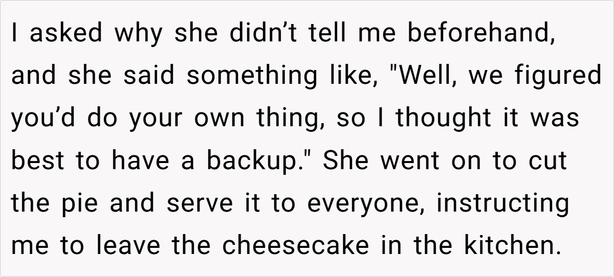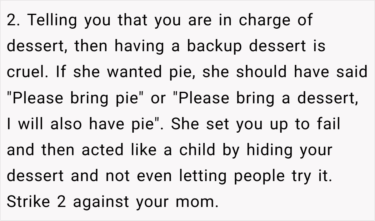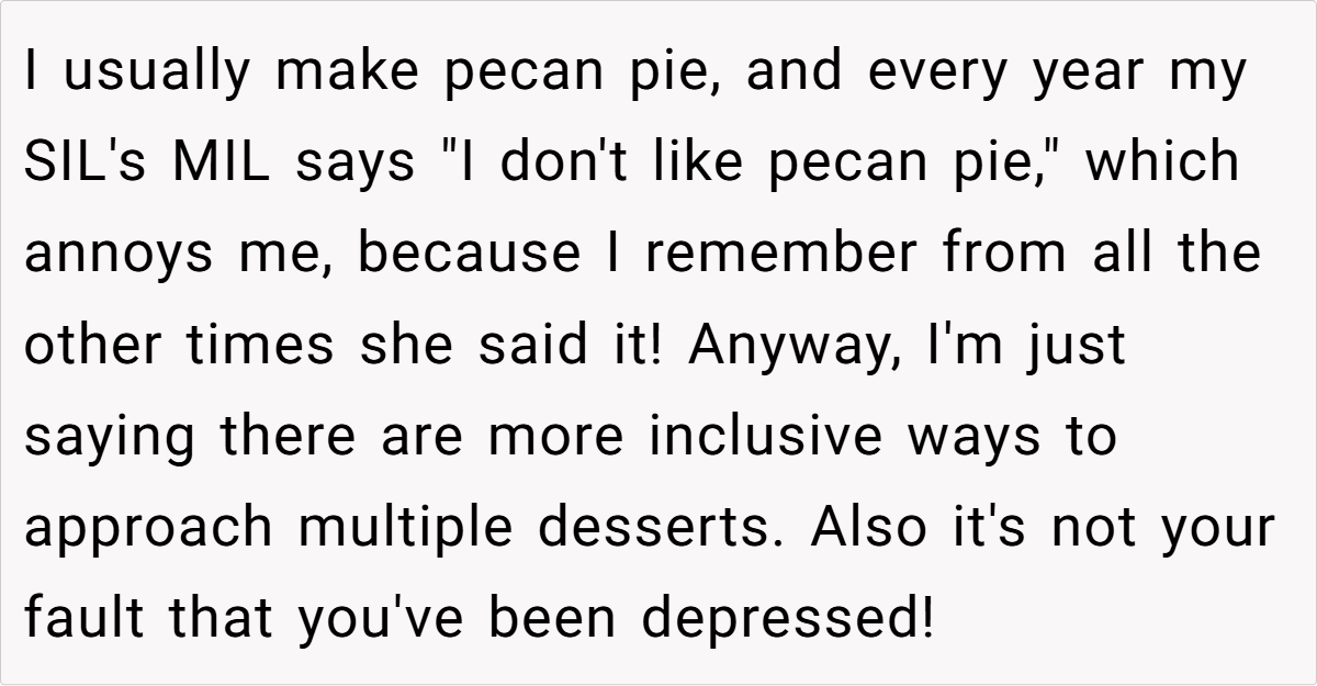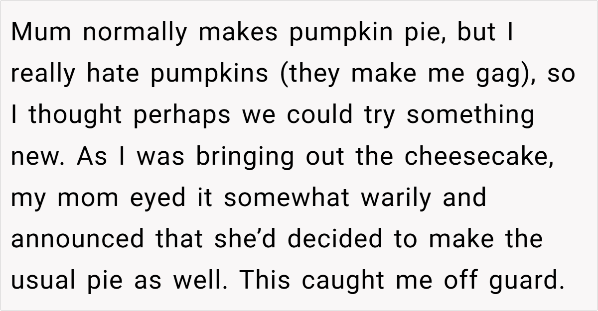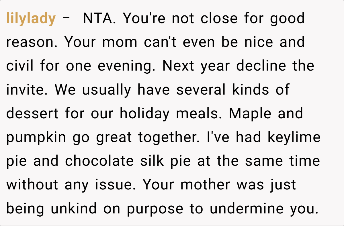 Others humorously compared the situation to a “culinary cold war,” where the clash of desserts symbolized deeper, unspoken conflicts. A few even commented that while pumpkin pie might be a tradition, no one should be forced to swallow old grievances along with it. Overall, the community’s tone was supportive, urging everyone to reflect on whether minor issues might sometimes be symptomatic of larger emotional struggles.