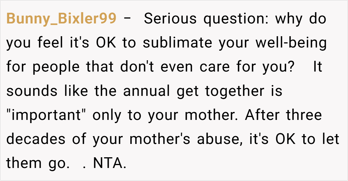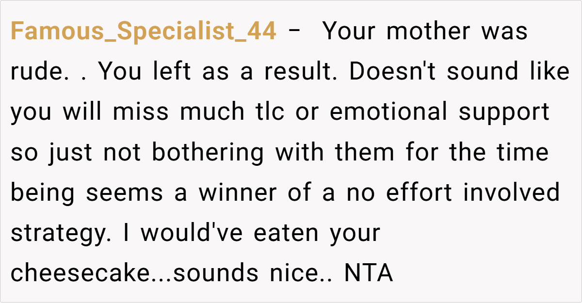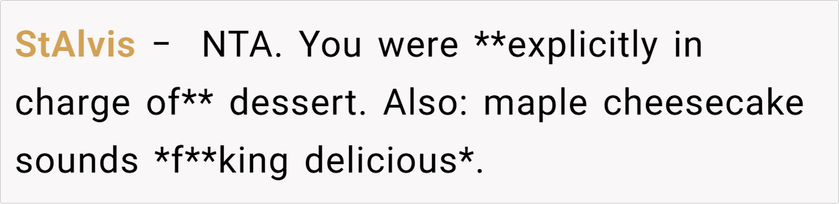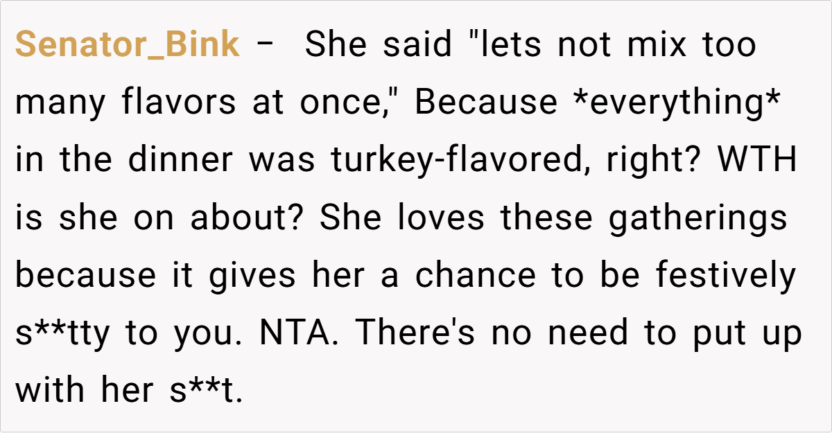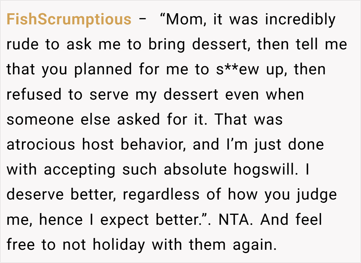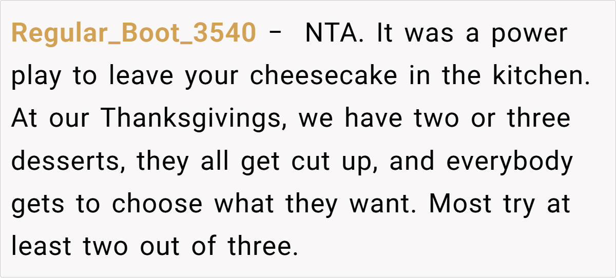 The Reddit community has had plenty to say about this Thanksgiving drama. Many commenters empathized with the storyteller, noting that holiday gatherings can sometimes amplify old family wounds. One popular remark was, “When your dessert becomes a proxy for all the years of criticism, it’s no wonder you had to walk out.”
