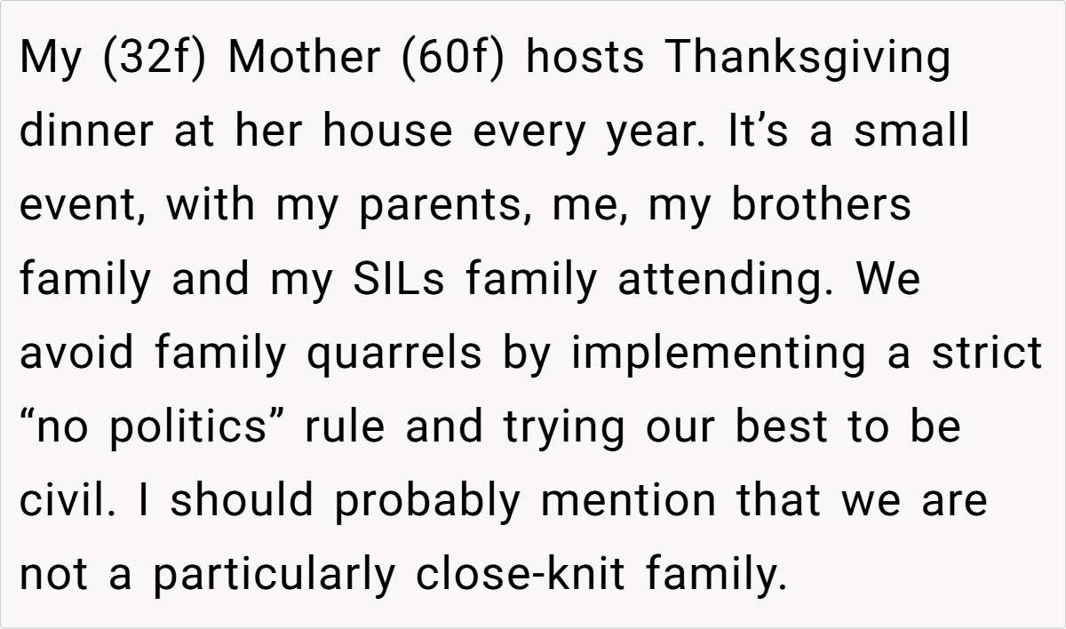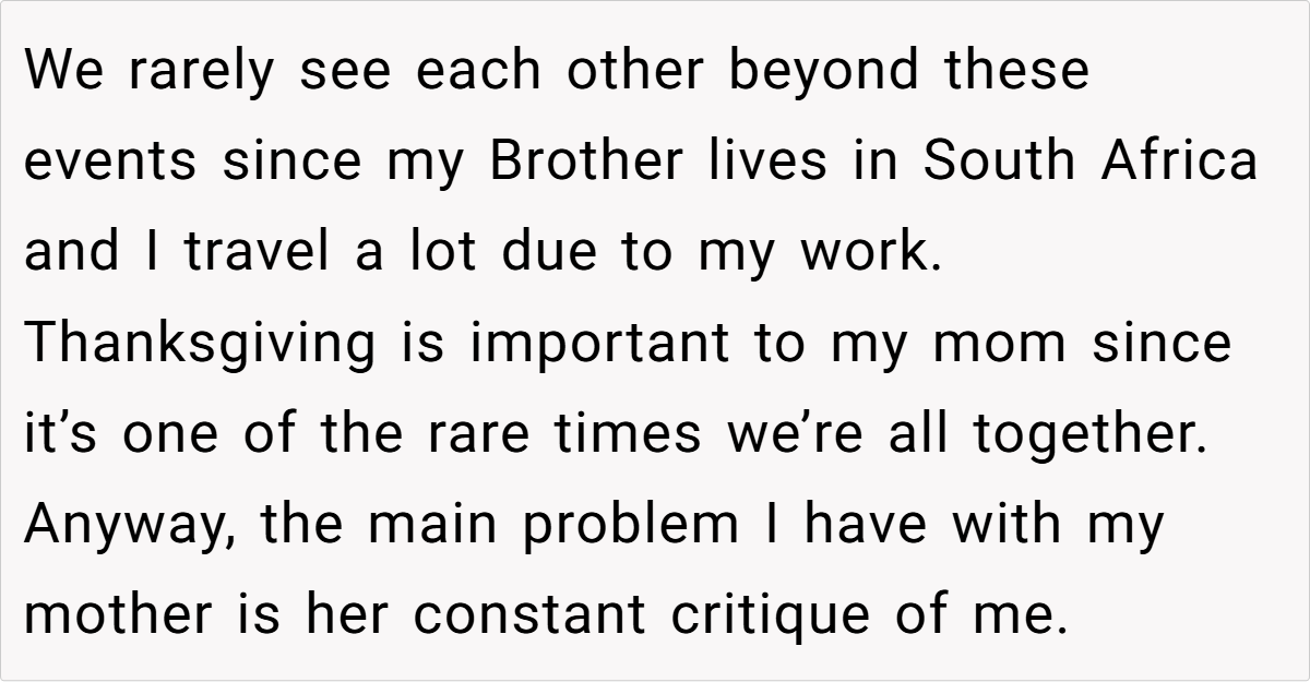Thanksgiving, for many, is a time to gather, share stories, and create cherished memories. For our storyteller—a 32‐year‑old who has long felt the sting of her mother’s critical remarks—the holiday dinner becomes a battleground for longstanding grievances. With a family that strictly avoids contentious topics like politics, even minor issues can spark unexpected emotional explosions.