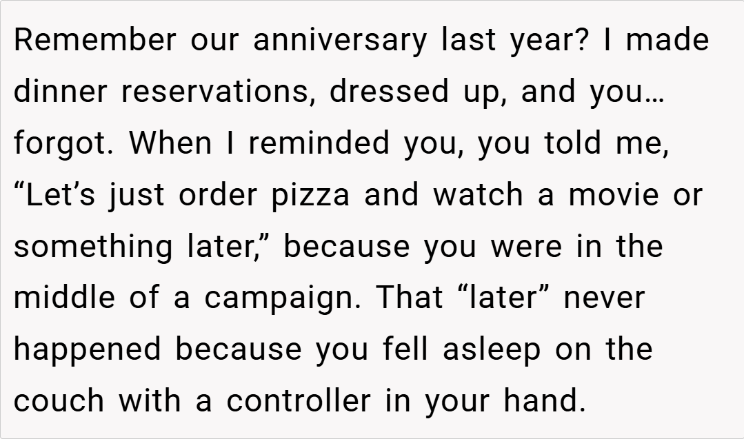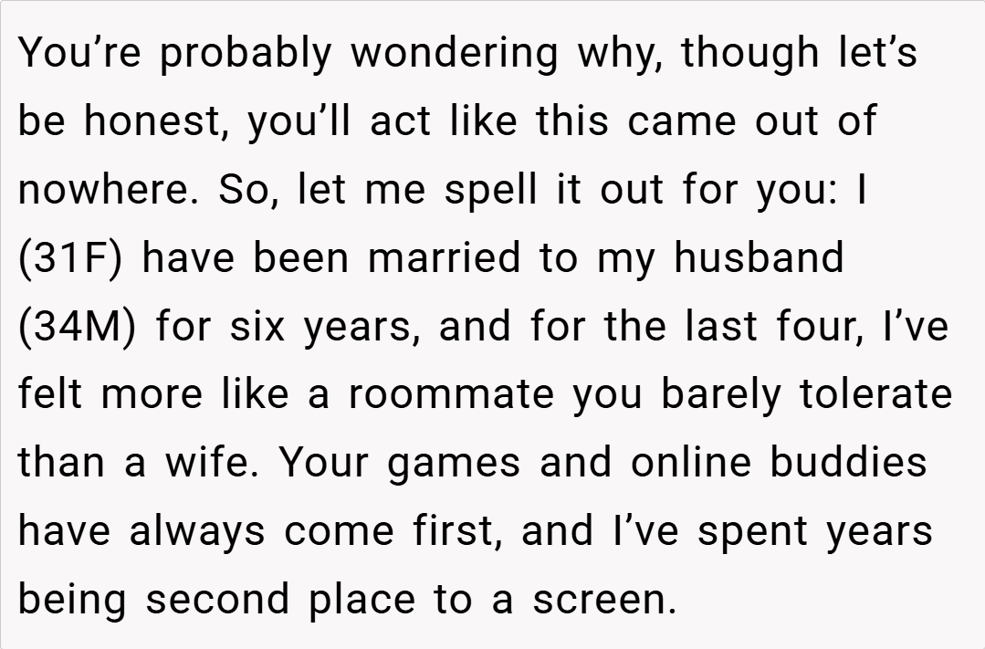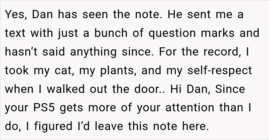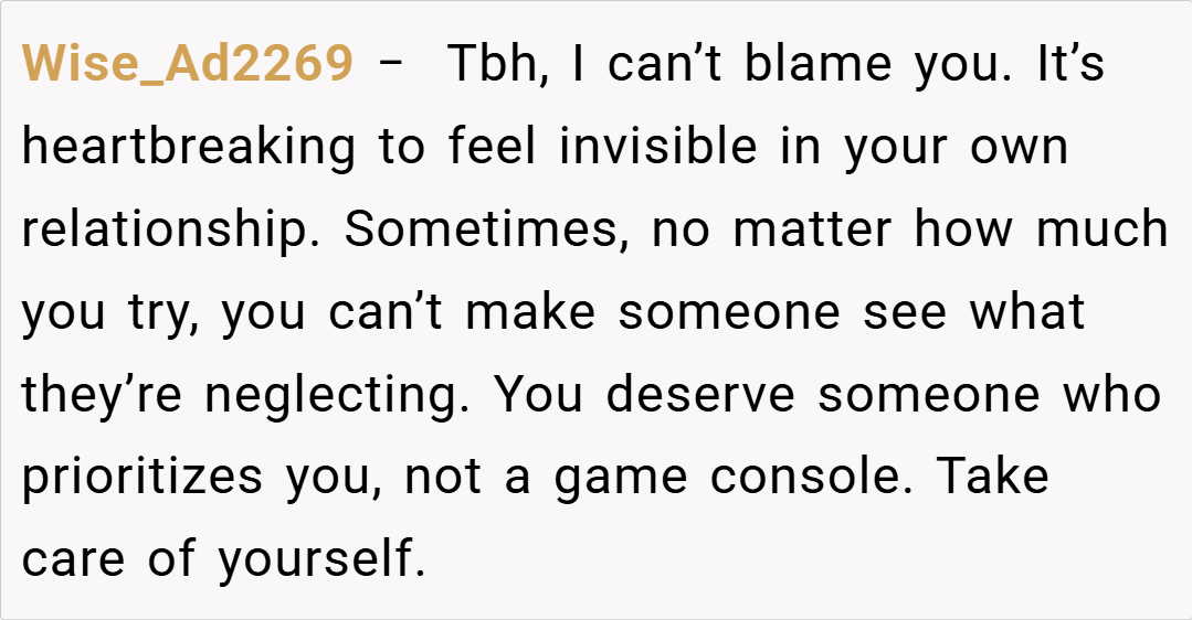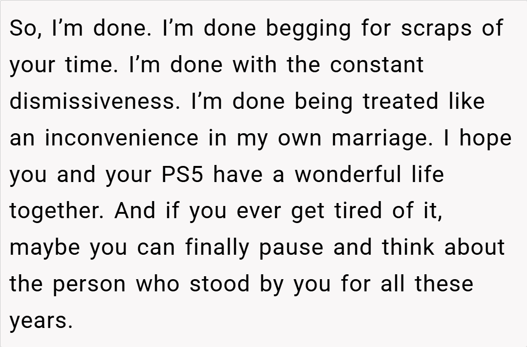 Ultimately, your decision to leave a note on your husband’s PS5 is not an overreaction—it is a bold assertion of your right to be loved and respected. While the method may have been bitter and abrupt, it reflects years of neglect and a deep need for change. This situation forces us to ask: How do we balance long-standing emotional neglect with the need to assert self-respect? Is there a way to repair a relationship when one partner has consistently prioritized a virtual world over genuine connection?