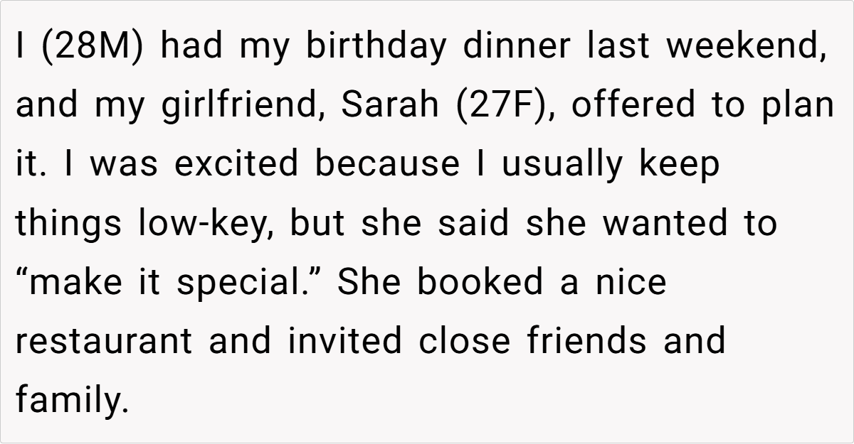 Sarah’s approach disregarded OP’s personal boundaries and preference for low-key celebrations. Instead of considering what would make OP happy on his birthday, she staged an event centered on herself.