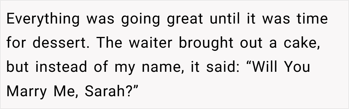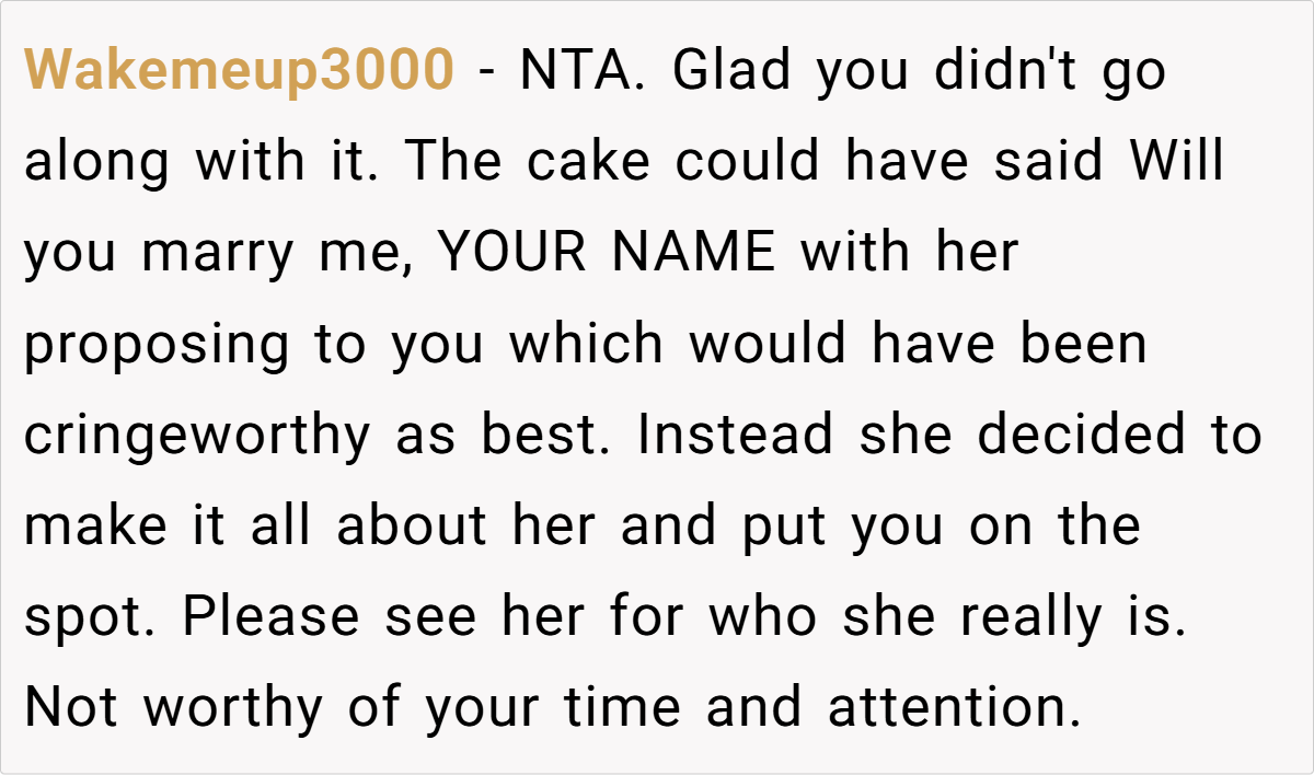 That’s the dilemma OP (Original Poster) faced when his girlfriend, Sarah, offered to plan his birthday dinner. What was supposed to be a heartfelt celebration quickly turned into an unwanted marriage proposal—with a cake that said, “Will You Marry Me, Sarah?” in front of OP’s family and friends. Caught off guard, OP walked out, only to later be flooded with criticism for embarrassing Sarah. But was he truly in the wrong?