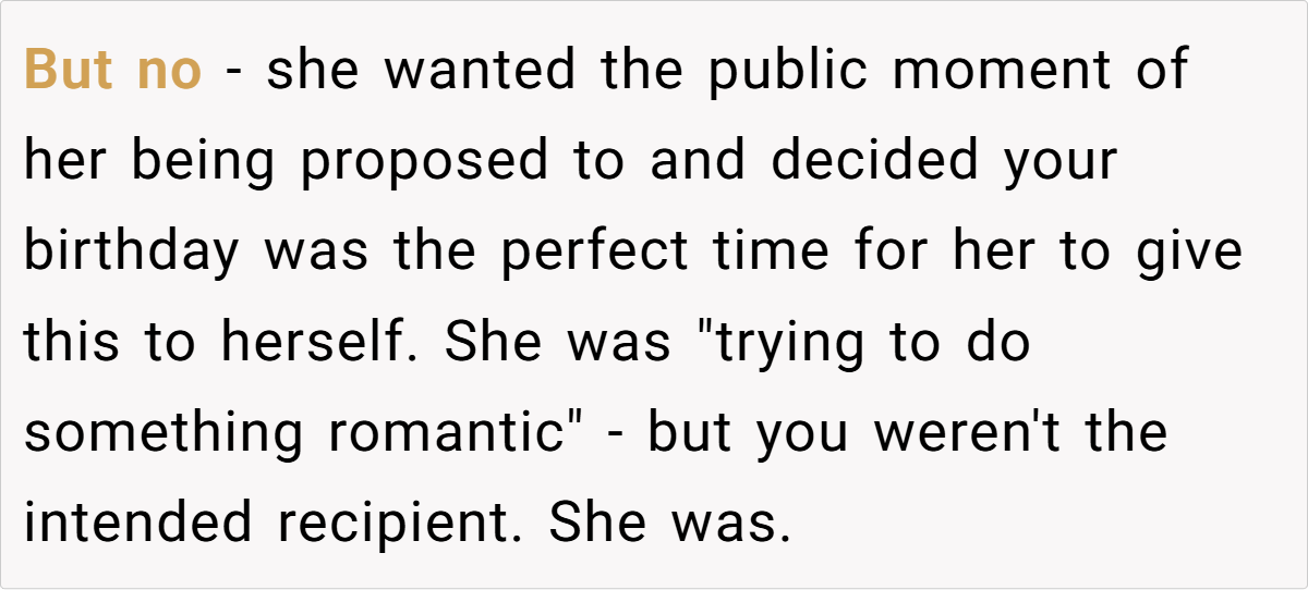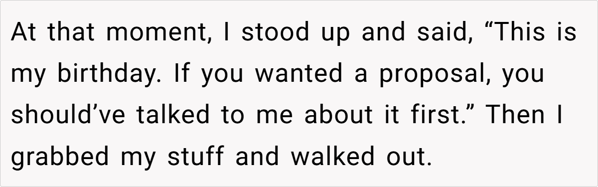 OP had every right to walk away from his own birthday dinner when it was hijacked for a marriage proposal. The expectation that he should have “played along” disregards his personal boundaries and the importance of mutual respect in a relationship.