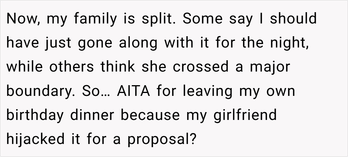 ‘AITA for Leaving My Own Birthday Dinner Because My Girlfriend Turned It Into a Proposal for Herself?’