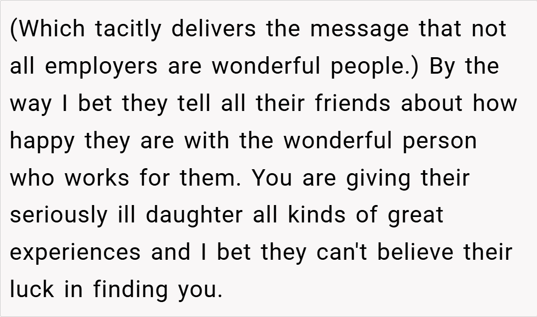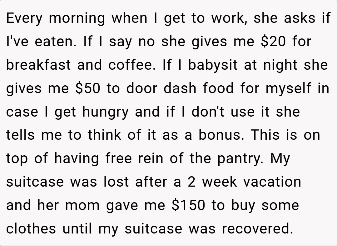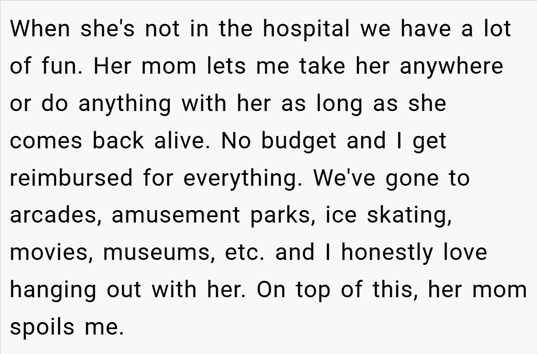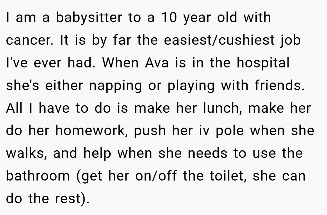 In the world of babysitting gigs, not every job is created equal—and sometimes, sharing your “cushy” experience can set unrealistic expectations for others. In this case, the OP, who works as a babysitter for a 10-year-old with cancer, enjoys a remarkably comfortable job with a generous family and plenty of perks.