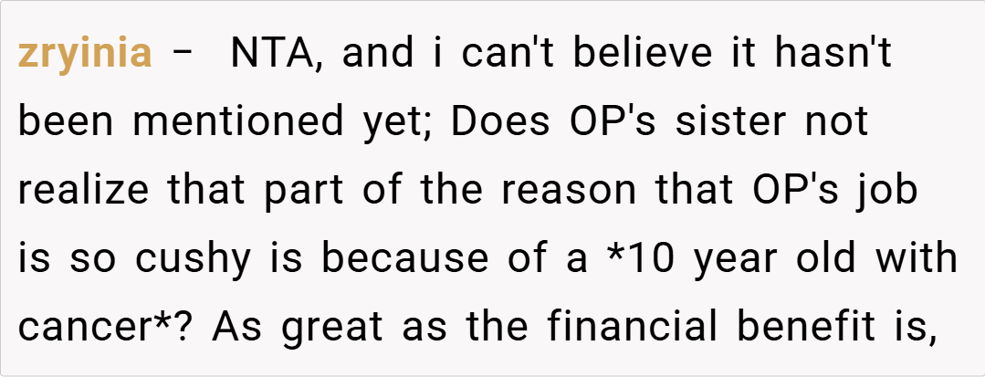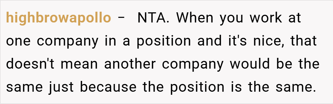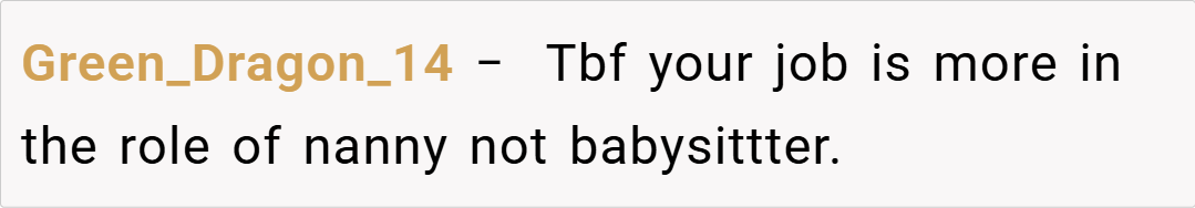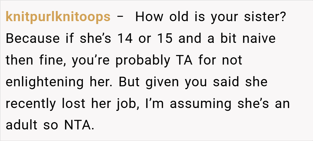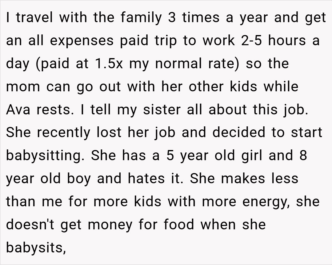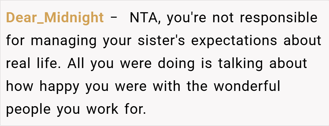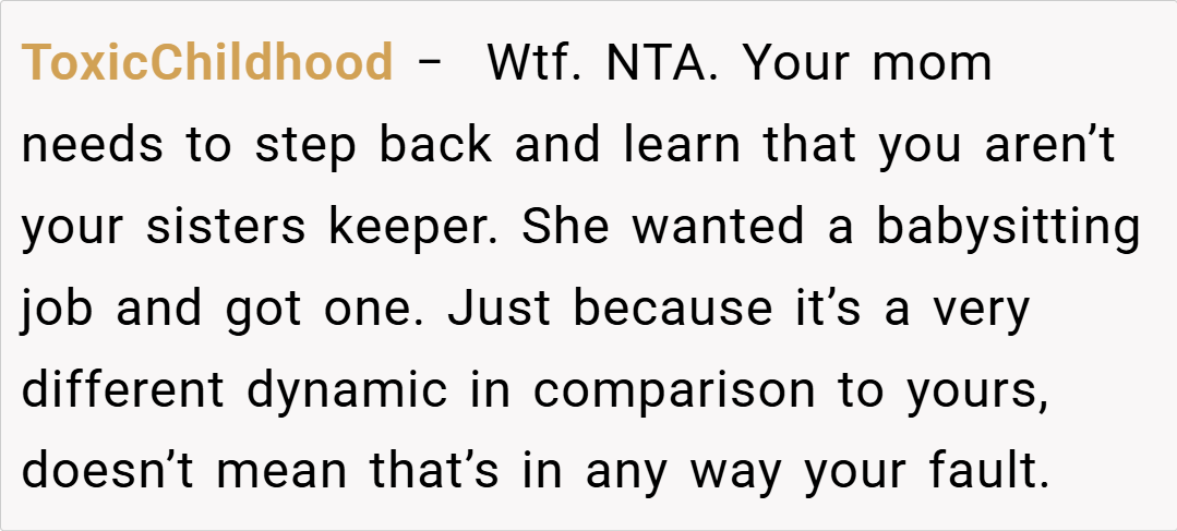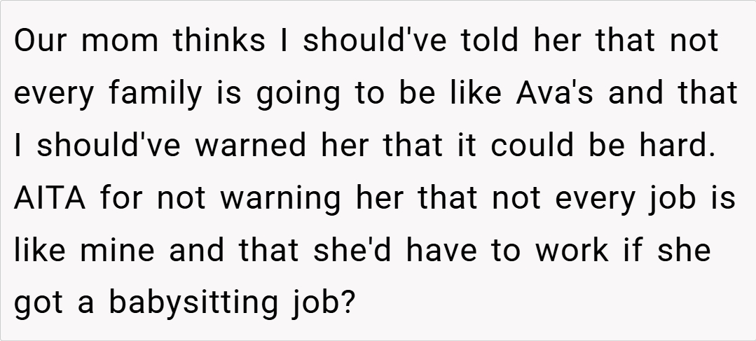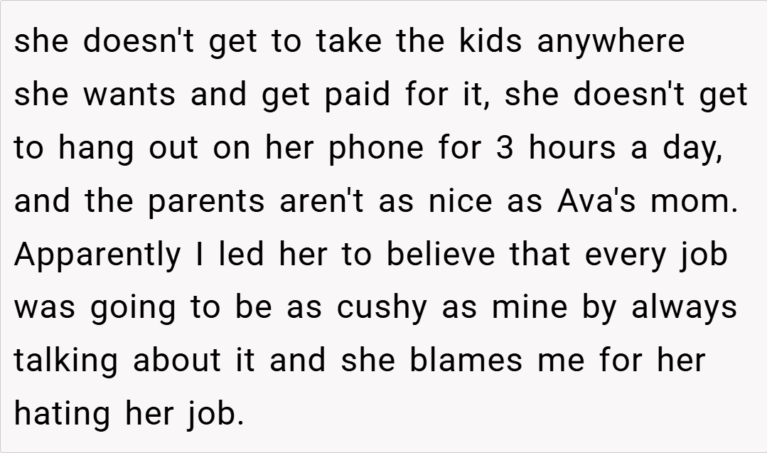 Many advised the sister to explore different opportunities or to be cautious when comparing jobs, rather than blaming the OP for her own misfortune. The consensus is clear: individual job experiences vary, and the OP’s role as a babysitter for a very specific family situation isn’t a blueprint for every similar job.