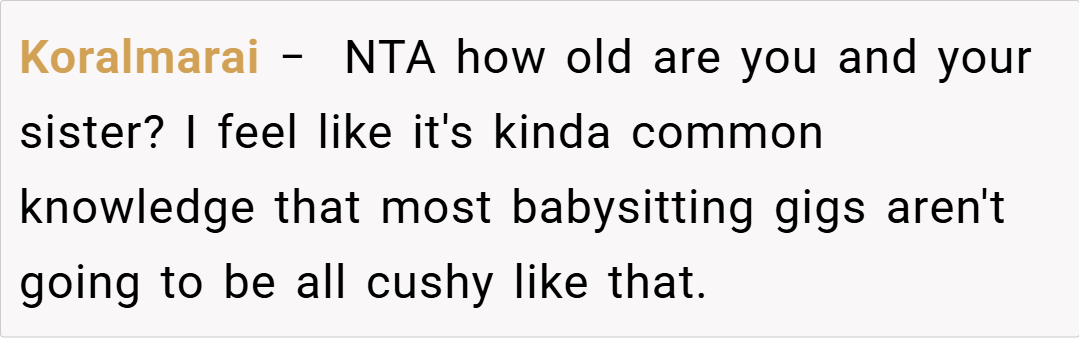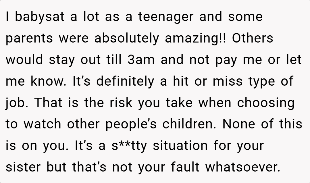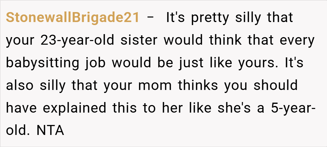 The Reddit community overwhelmingly supports the OP, with many commenting that she isn’t responsible for her sister’s misinterpretations. Commenters pointed out that it’s common knowledge that not every babysitting gig will offer the same perks.