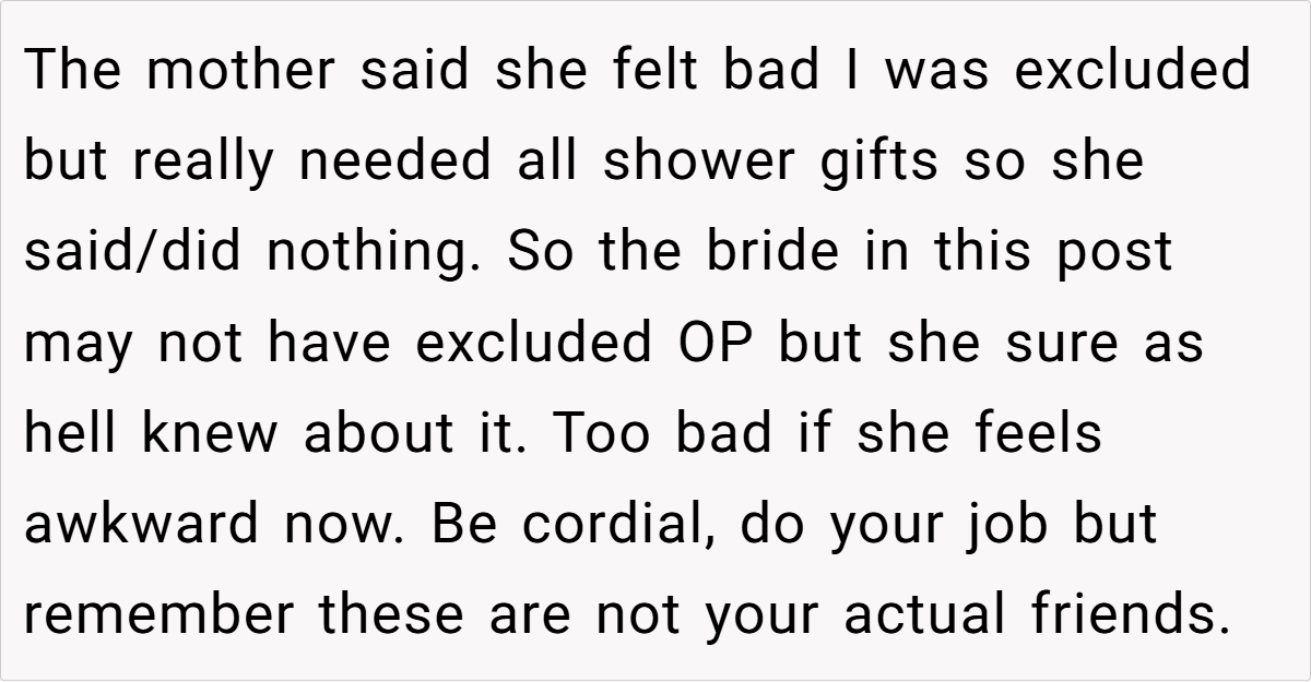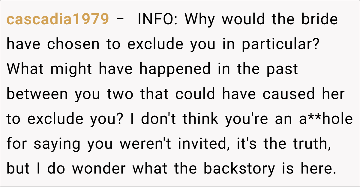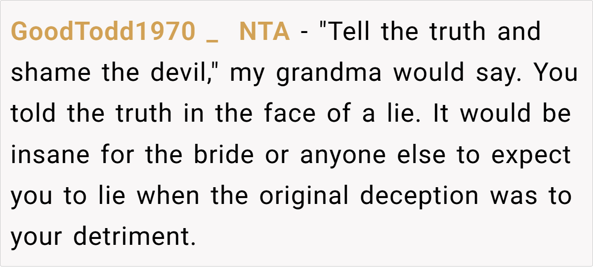 A few voices did wonder if there was some backstory or personal conflict between me and the bride, asking, “Why would the bride single you out?” Yet even those responses agreed that, as far as I’m concerned, being honest in that meeting was fair game. One user even quipped that if the bride was embarrassed by the truth, “she should have been upfront about it instead of letting lies fly.”