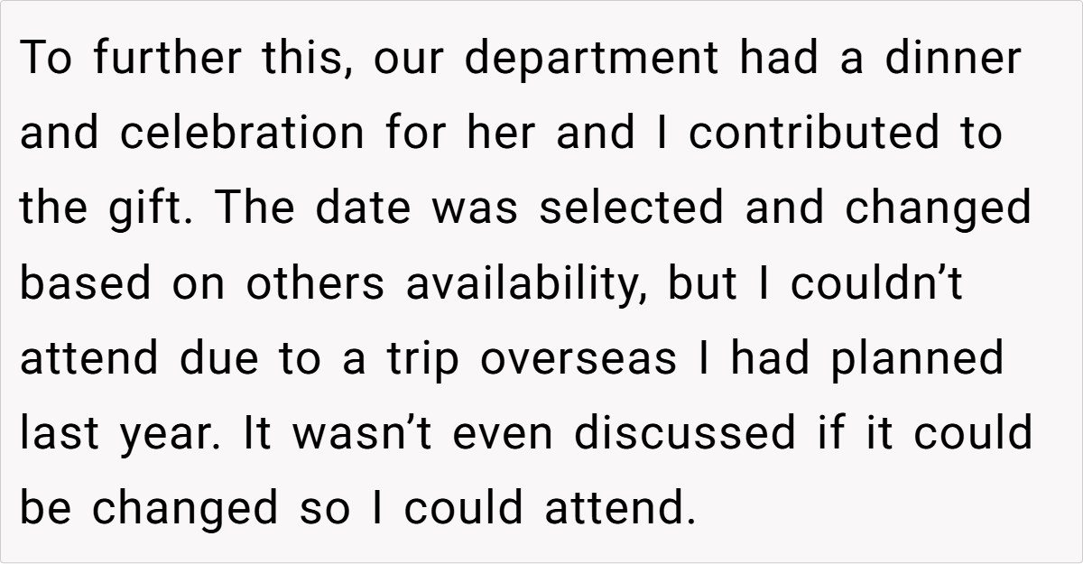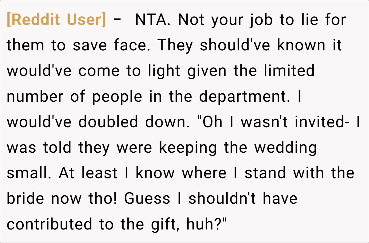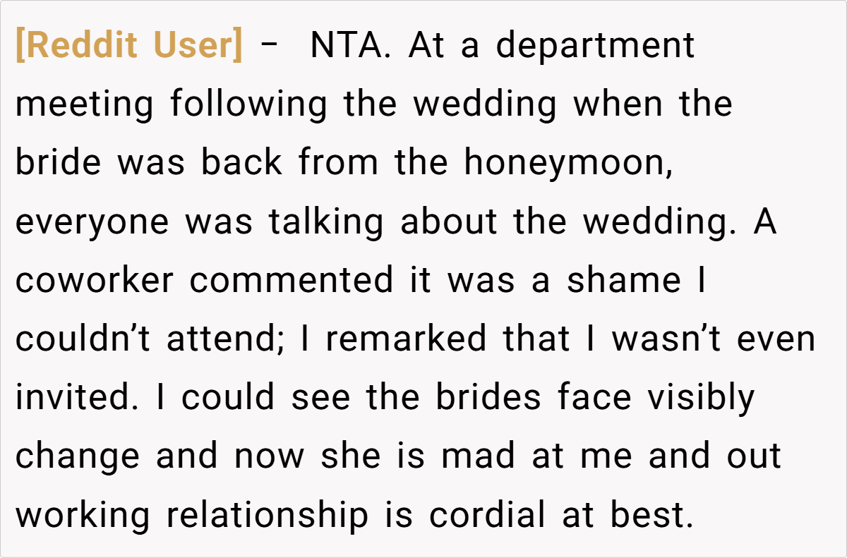 When the topic came up at a department meeting after the wedding, I bluntly remarked that I wasn’t even invited. That small moment not only caused the bride’s expression to change dramatically, but it has also strained our working relationship. Now, with our department’s celebration and gift-giving behind us, I’m left wondering: Was I wrong for clarifying the truth in front of everyone?