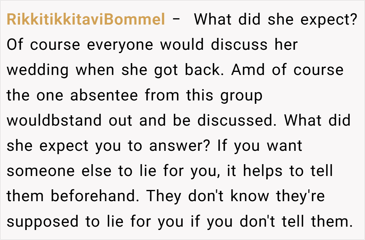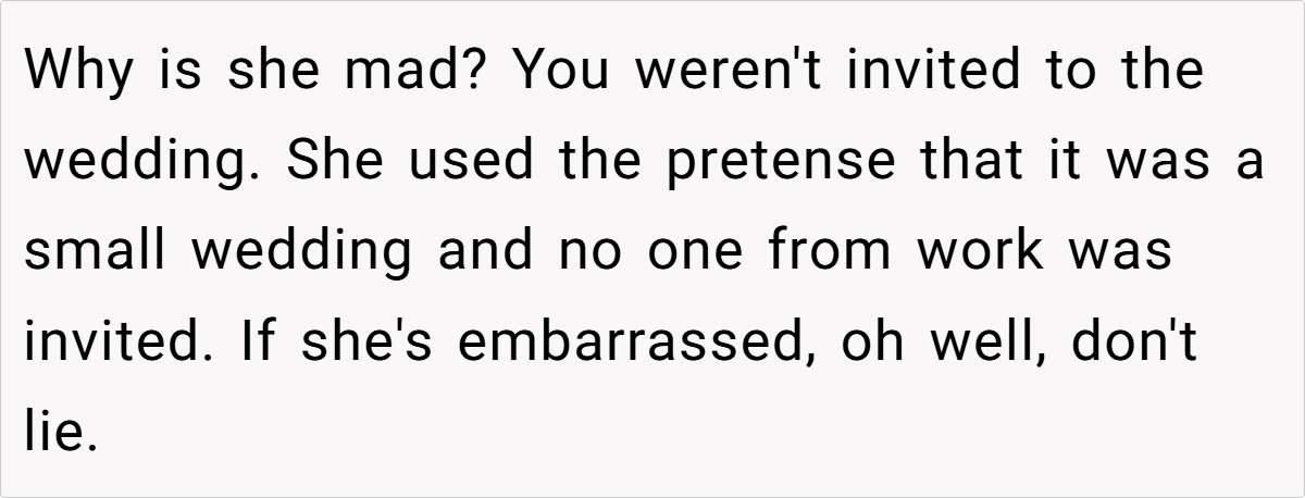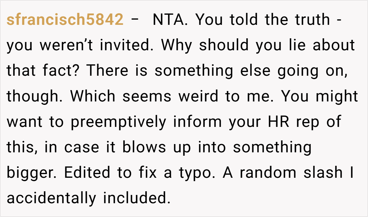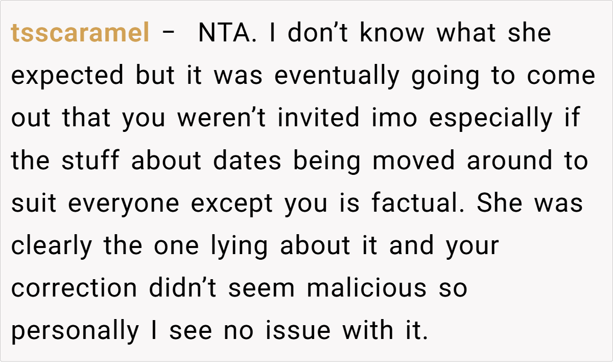 Reddit users overwhelmingly sided with me in this situation. One commenter summed it up by saying, “You told the truth—you weren’t invited, so why pretend otherwise?” Another noted, “If someone lies about your absence, you have every right to correct it. It’s not your job to cover up for their immaturity.”