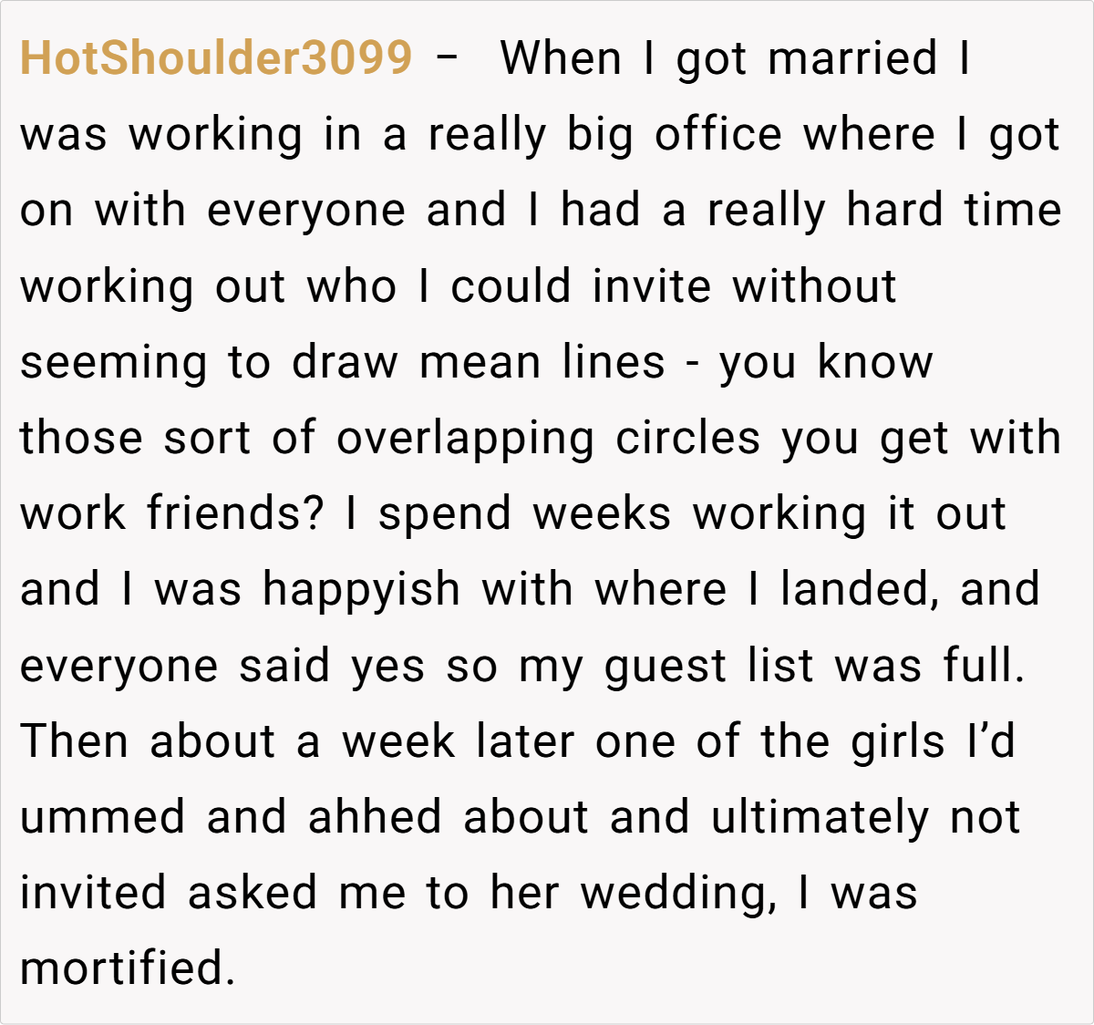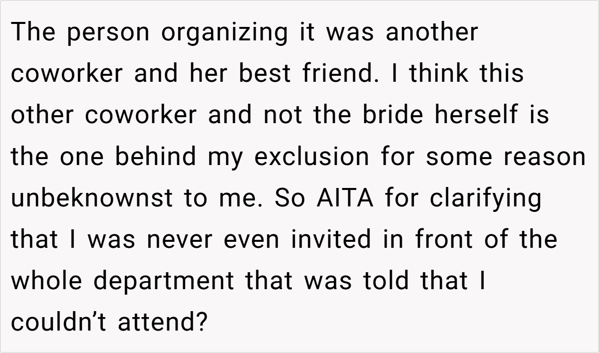 Ultimately, I stand by my decision to clarify that I wasn’t invited. Honesty in the workplace—especially when it comes to something as personal as a wedding invitation—should be respected, even if it ruffles a few feathers. I’m not trying to create conflict; I simply want to know where I stand and avoid future misunderstandings.