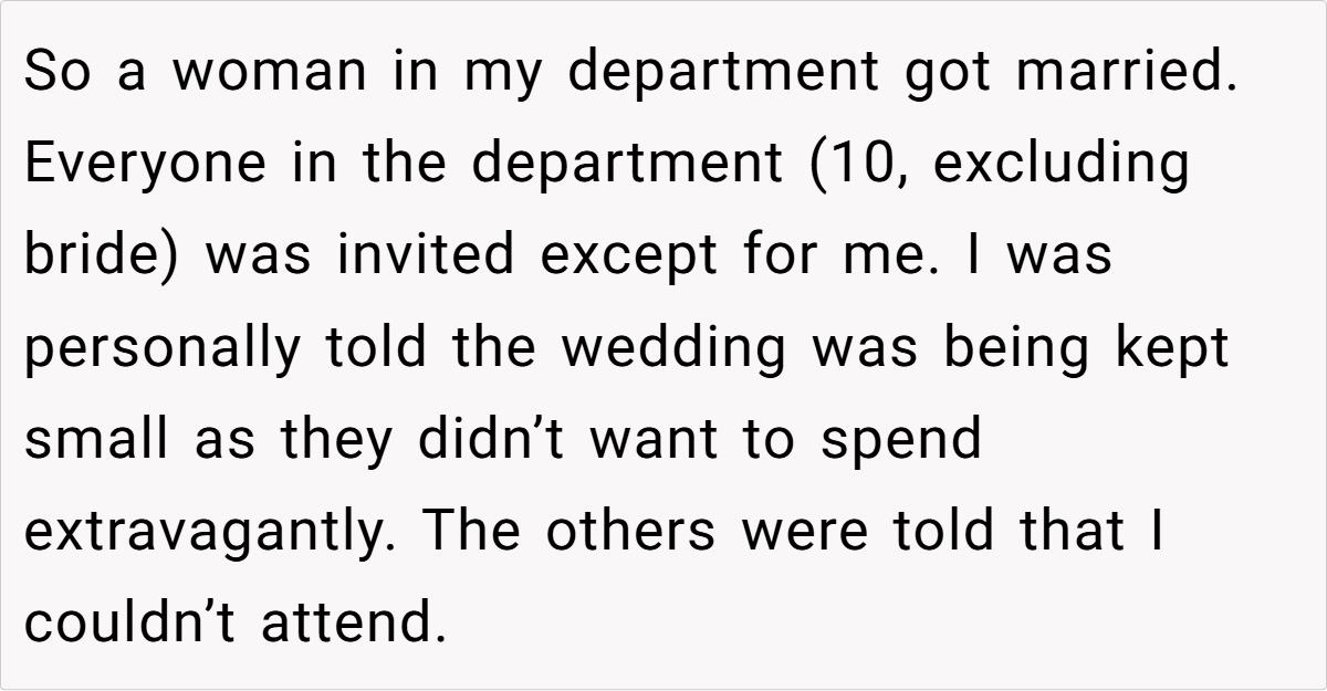 ‘AITA for letting people know I was the only one in my department not invited to coworkers wedding when they were told I couldn’t attend?’