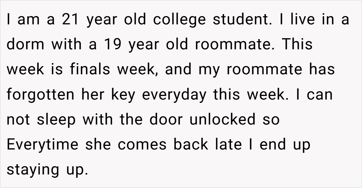 Finals week can turn even minor annoyances into major issues, especially when it comes to living with roommates. In this update, a 21-year-old college student recounts how repeated forgetfulness about a key during finals week forced them to lock their dorm room door—resulting in a major fallout. With sleep and security on the line, the decision to lock the door sparked a heated debate about whether personal boundaries or roommate obligations should take precedence.