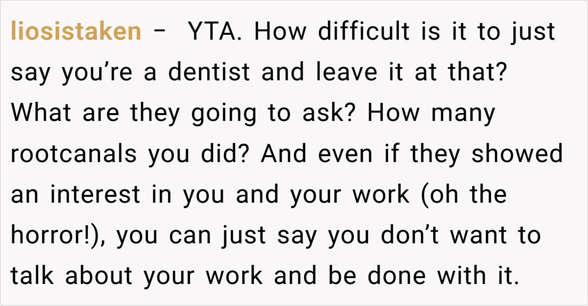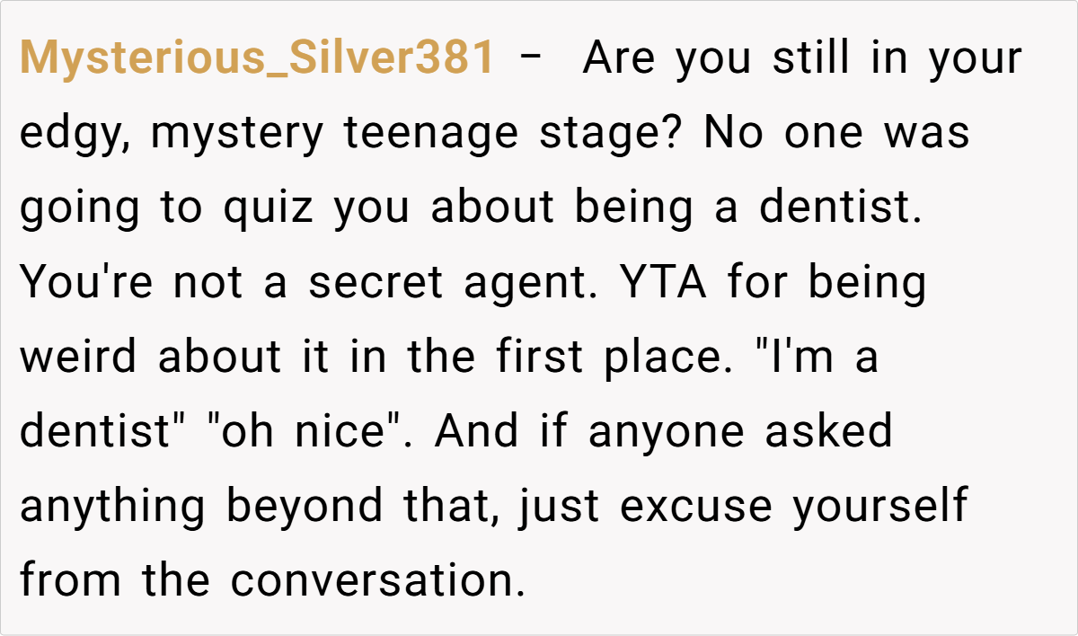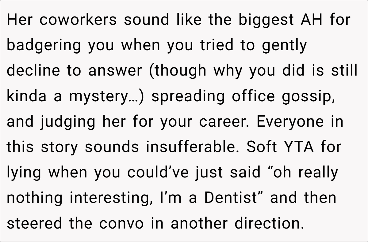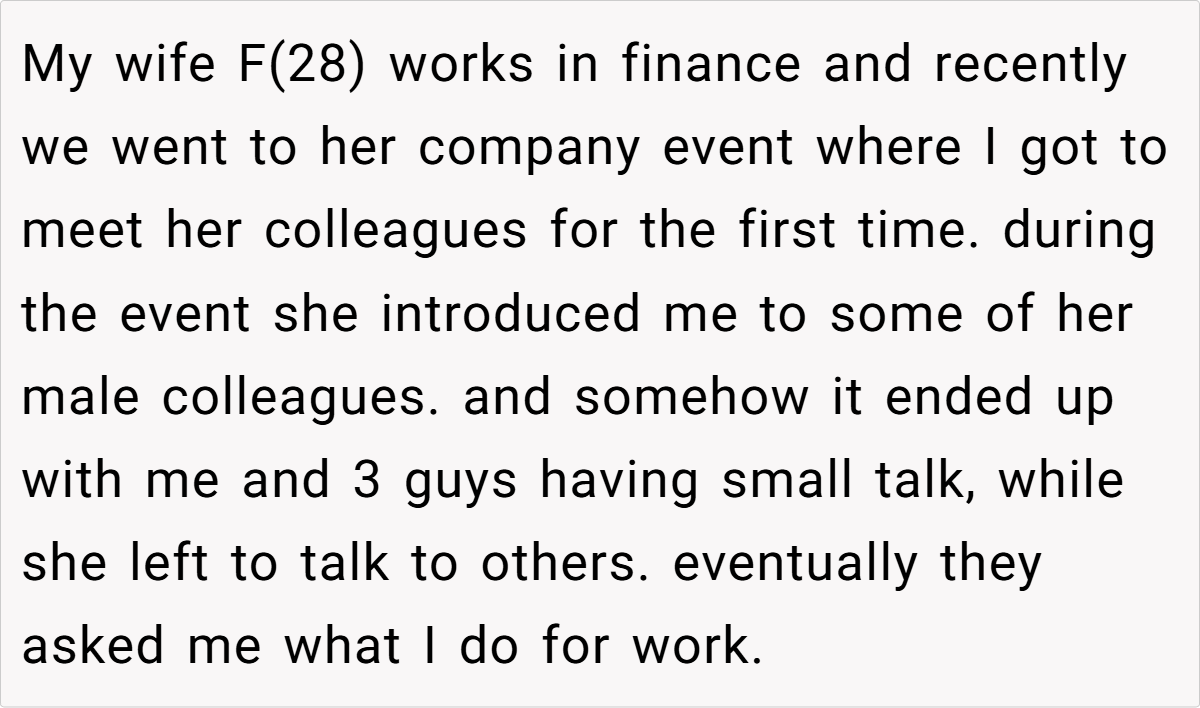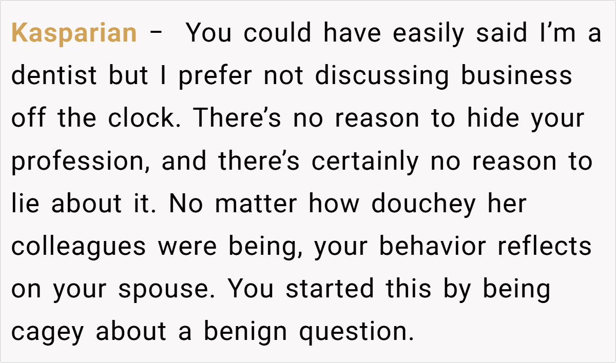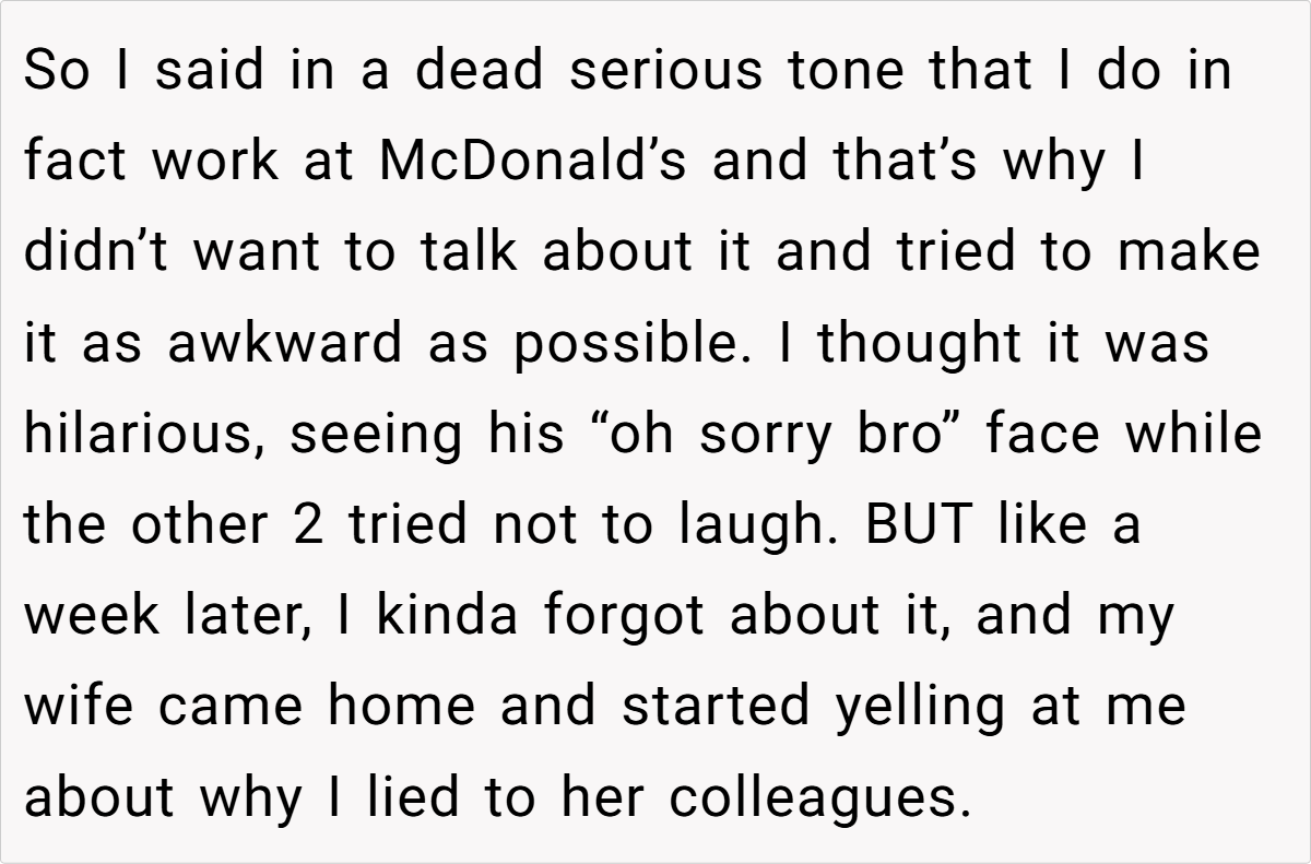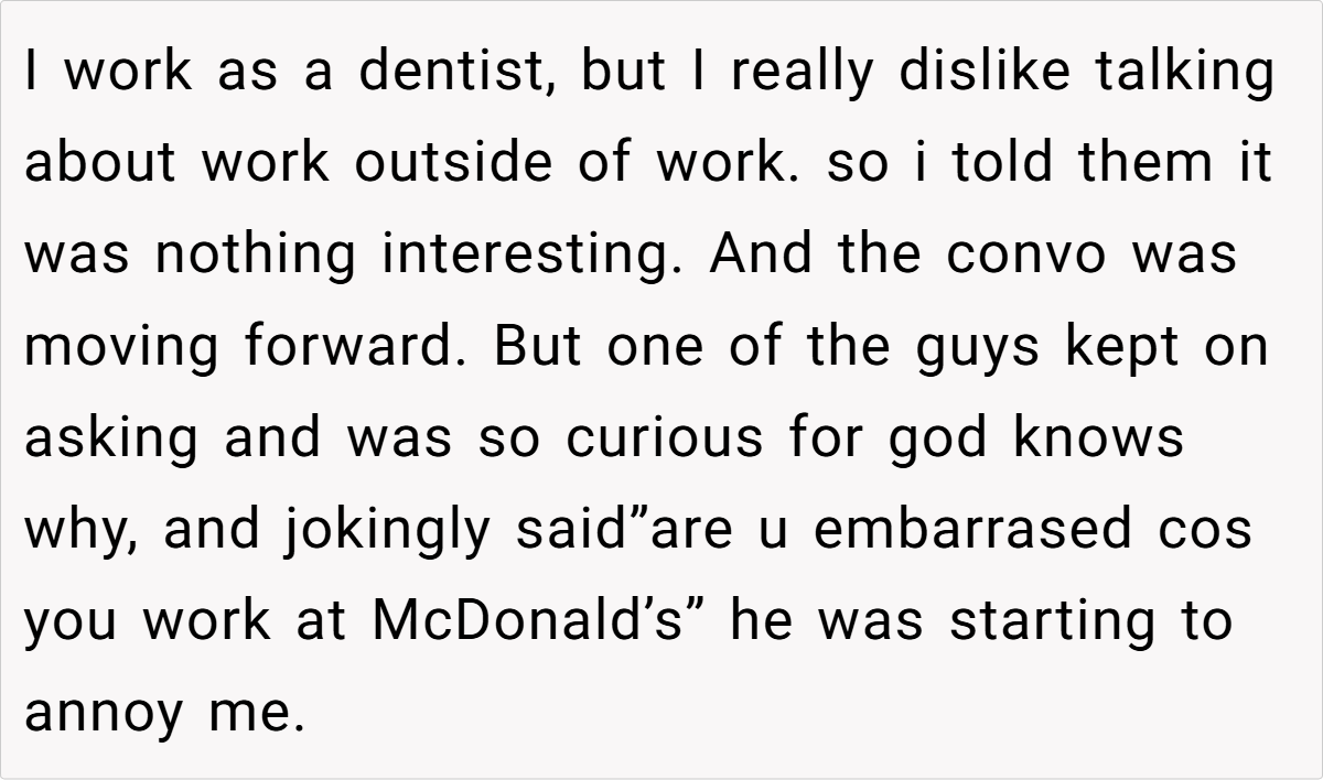 At social events, a little white lie can sometimes spiral into a full-blown family feud. In this case, a 28‑year‑old dentist recounts how his attempt at humor at his wife’s company event ended up backfiring. While mingling with her colleagues, he chose to downplay his work by claiming he works at McDonald’s—rather than sharing his true profession.